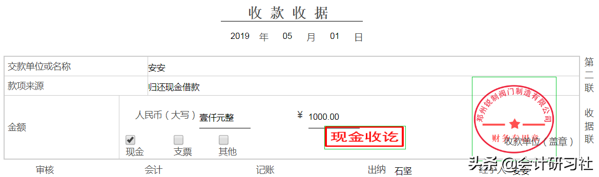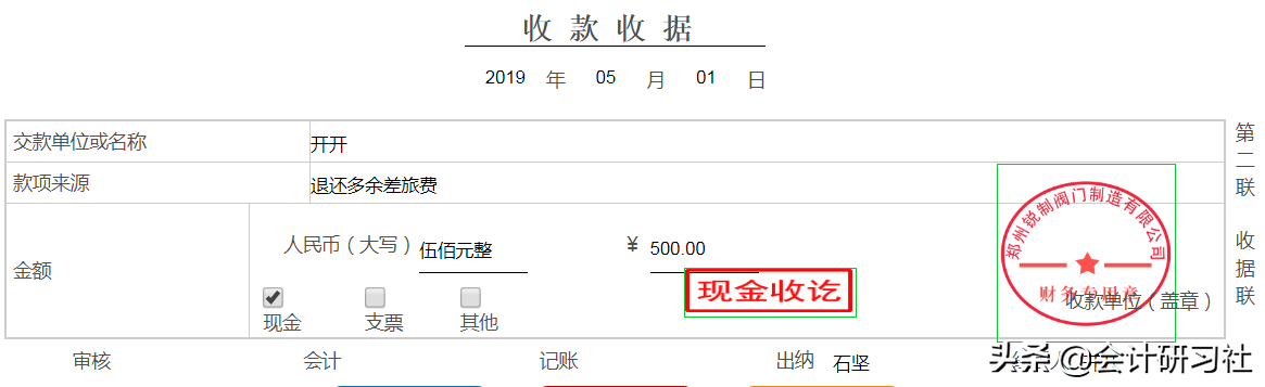 ②:出纳员石坚在收款收据第二、第三联上盖现金收讫章,第二联撕给付款方,第三联交给会计记账。