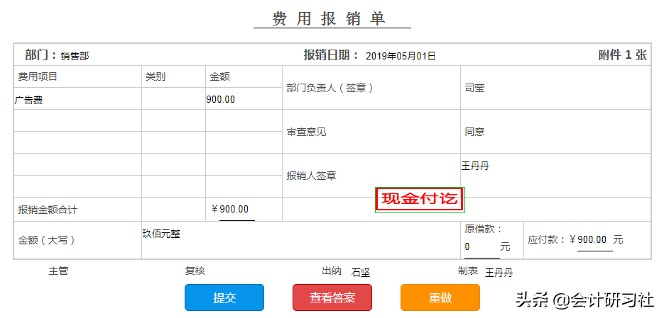 2019年05月01日,销售部王丹丹报销广告费900元,以现金支付。