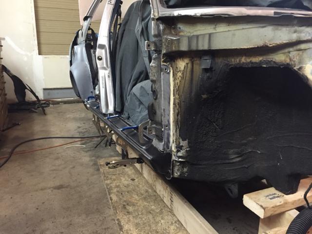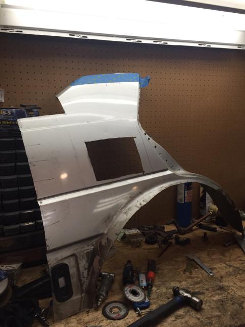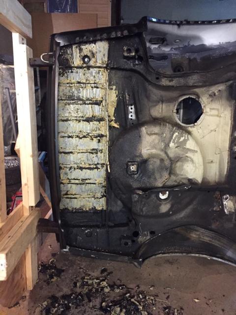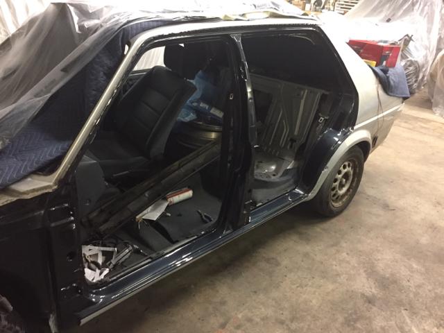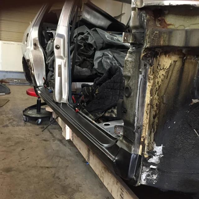 这些锈蚀是最先要解决的问题,整台车的左侧情况略好,我先将左后轮眉上的锈蚀进行了切割,并用二手零件上完好的部分进行了焊接,另外还切下了两侧整个车门槛板,定了一组原厂零件,等到货之后进行了安装。