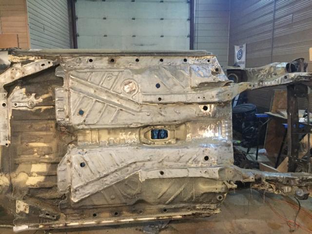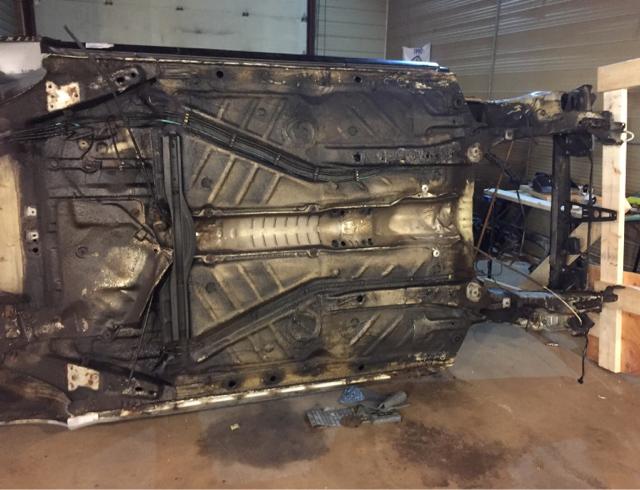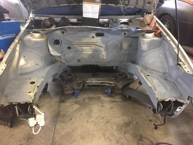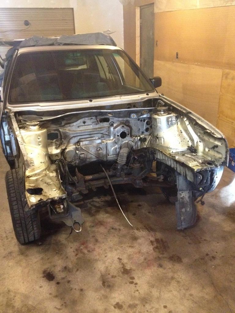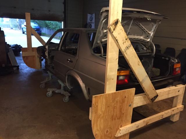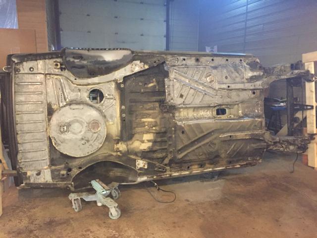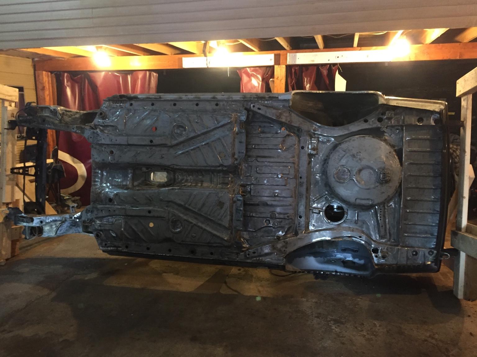 在车身修复完成之后,我把注意力转移到了底盘上面,准备进行底盘重塑。我用木头做了一个能够翻转车身的支架,在将底盘零件都拆空之后,将整个车身挂在了支架上面。