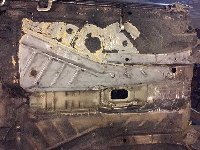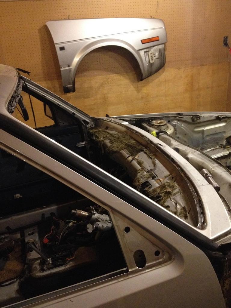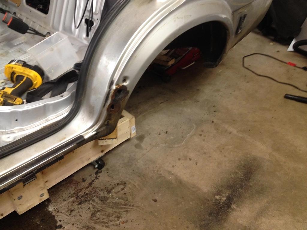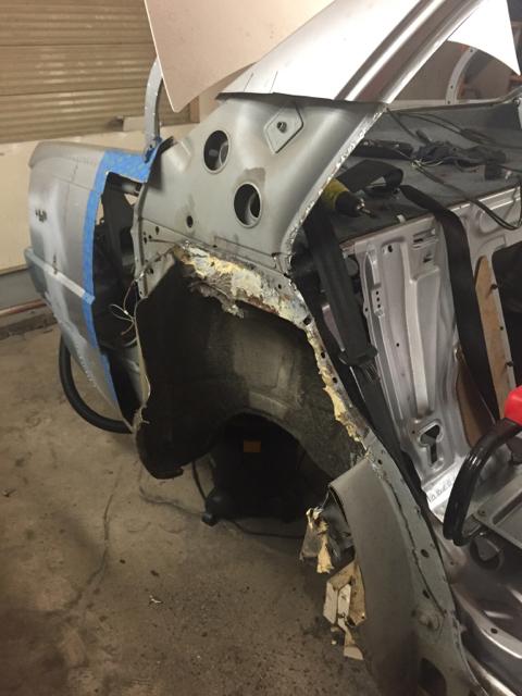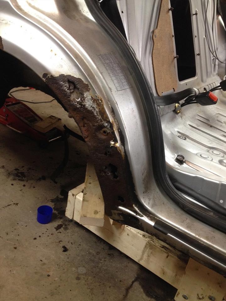 右侧车身比较难处理,首先右后侧内轮舱面板锈穿,后来发现网上竟然有原厂零件,整个部分可通过拆卸焊点拆下,不必切割车身。拆下面板之后,我将新零件假组查看契合程度,结果非常匹配。
