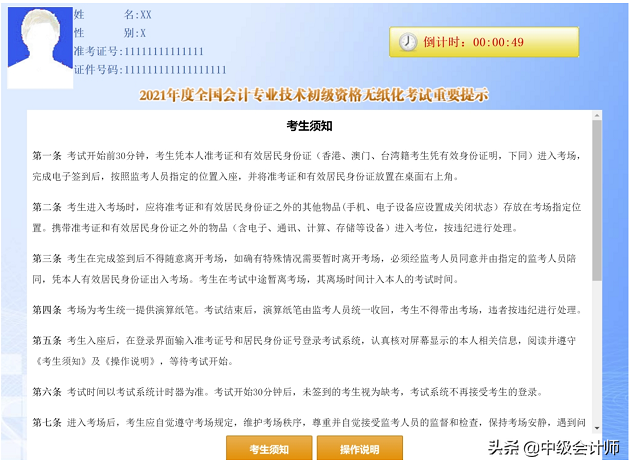 4. 按照有关工作要求,《初级会计实务》科目考试时长为105分钟,《经济法基础》科目考试时长为75分钟。两个科目连续考试,时间不能混用。两个科目需分别交卷;交卷后,将不能返回本考试科目作答。