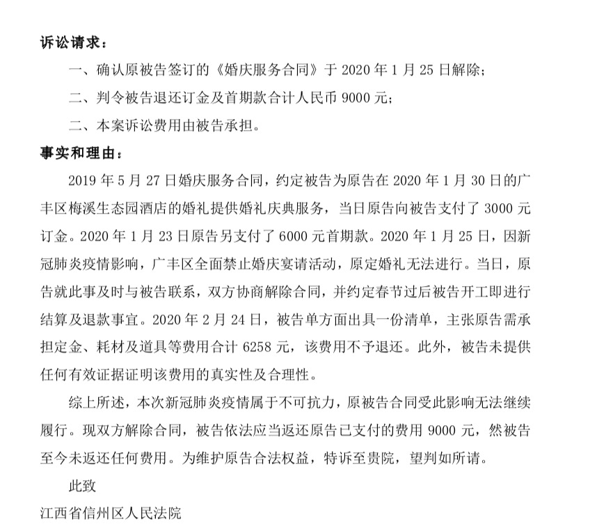 新冠肺炎疫情真的对大家的生活影响很大,各行各业都或多或少受到波及,作为我本人,也因为新冠肺炎疫情的发生不能举办婚礼,辛辛苦苦准备了好久,也只能作罢。那不能举办婚礼,接下来自然就告知婚庆公司解除合同,考虑到新冠肺炎属于不可抗力,符合法定解除情形,且合同约定了免责事由就是因不可抗力导致合同无法履行的,以为大家互道遗憾,退还订金,大家宅家为国家做贡献就好,没想到却因此引发了我人生中的第一场诉讼之旅。