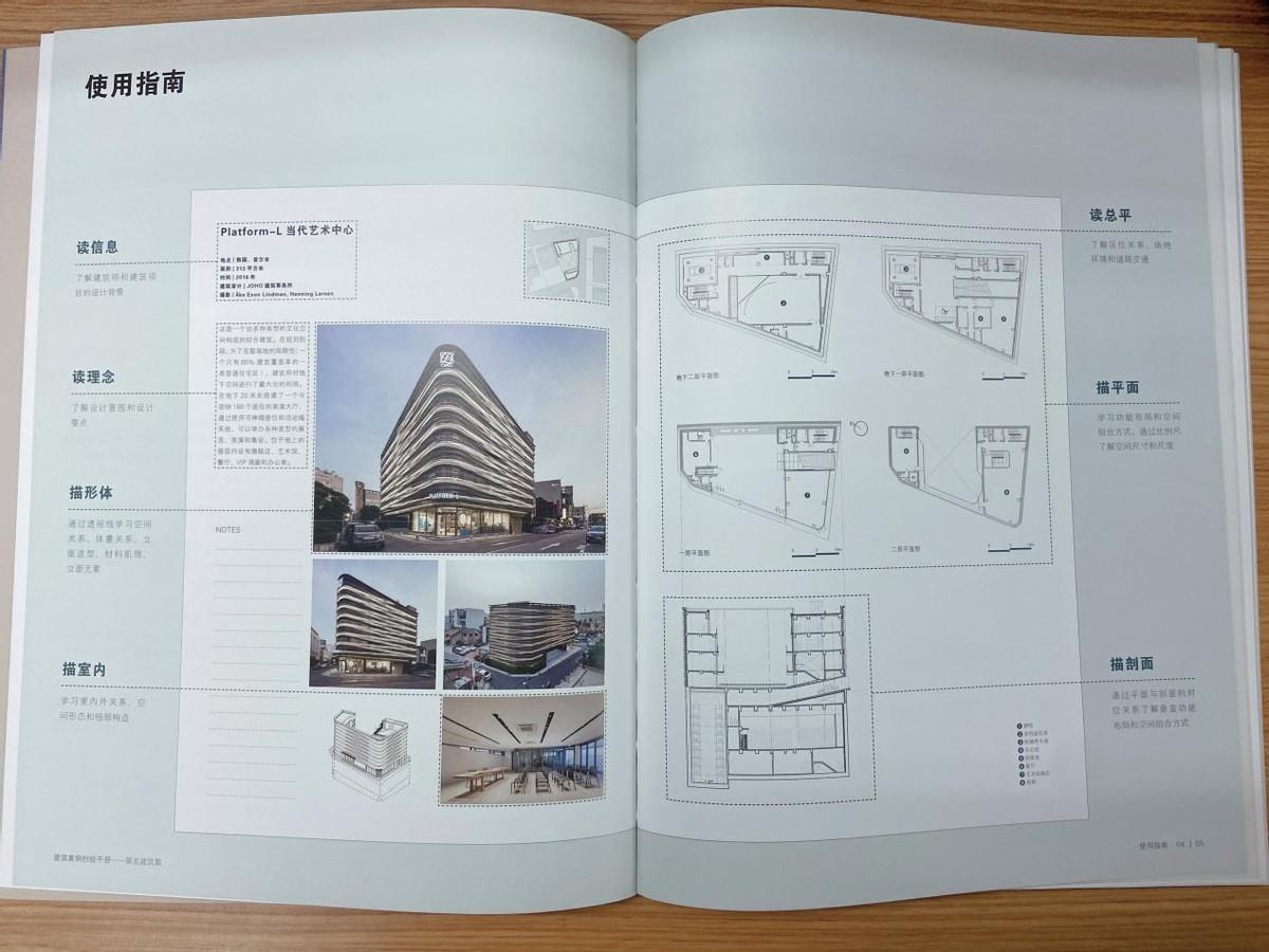 《建筑案例抄绘手册》的开篇贴心为读者准备了一份使用指南,指导使用者一步一步,从读信息、读理念到描平面、描剖面,有序地进行抄绘训练。与其他抄绘材料不同的是,这本书增加了比例尺,帮助读者建立尺寸与尺度的空间意识,并且标示了建筑的透视线,辅助读者进行建筑透视的绘画。