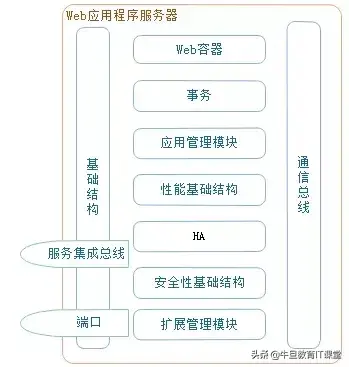 从上图中可以看到 Web 应用服务器包括了 Web 容器,同时内置了支撑企业应用的事务,安全,集成,通信,高可用等等功能。