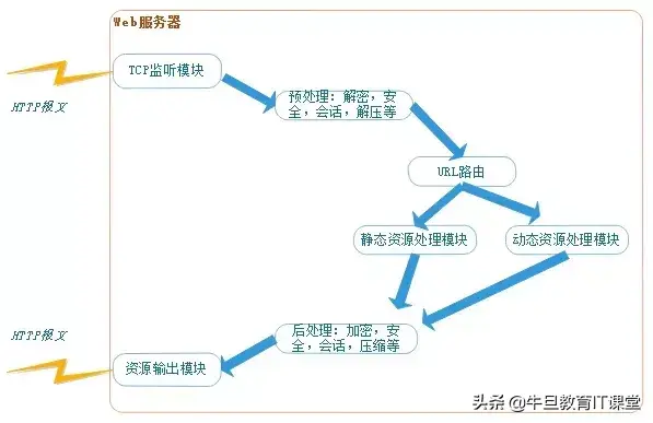 在用户代理上用户发起资源请求,请求内容包括但不限于:指定资源的唯一标识 URI,指明动作类型(GET/POST/DELETE/PUT…)用户代理解析用户输入 URI 并从中获取目标域名,交由 DNS 服务器解析。如果 URI 中指定某 IP 地址,就无需这步。如果与服务器的会话还没建立,此时先建立 TCP 连接,并完成 HTTP 协商(确定双方均可接受的处理方式,包括协议版本,是否加密,内容格式等等)。用户代理把请求内容封装成 HTTP 数据包向服务器发送。服务器接收到资源请求并以之前协商好的方式解包并处理。服务器请求的资源封装成 HTTP 数据包并返回给用户代理。接下来重点说说服务器端的工作原理,如下图: