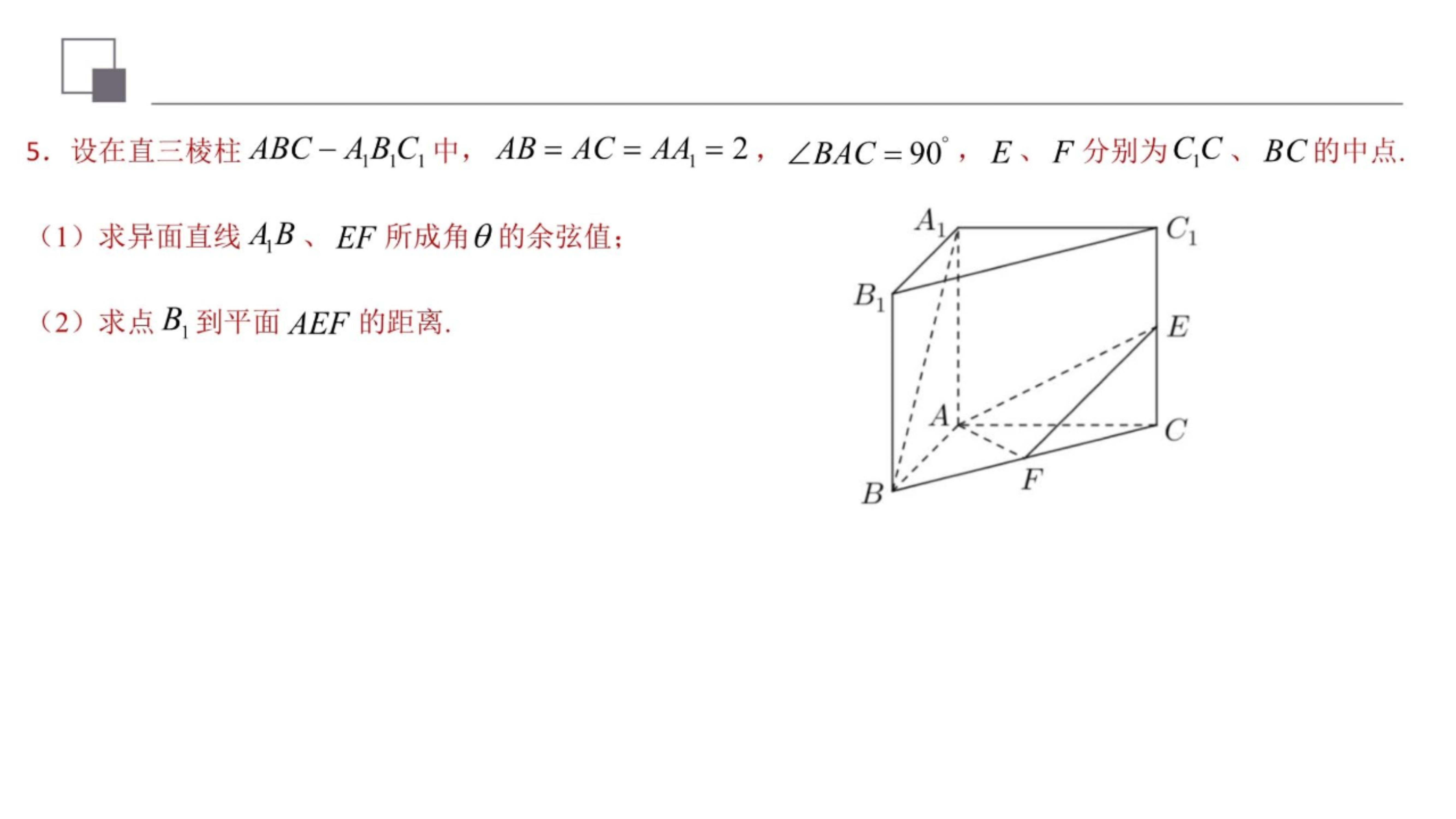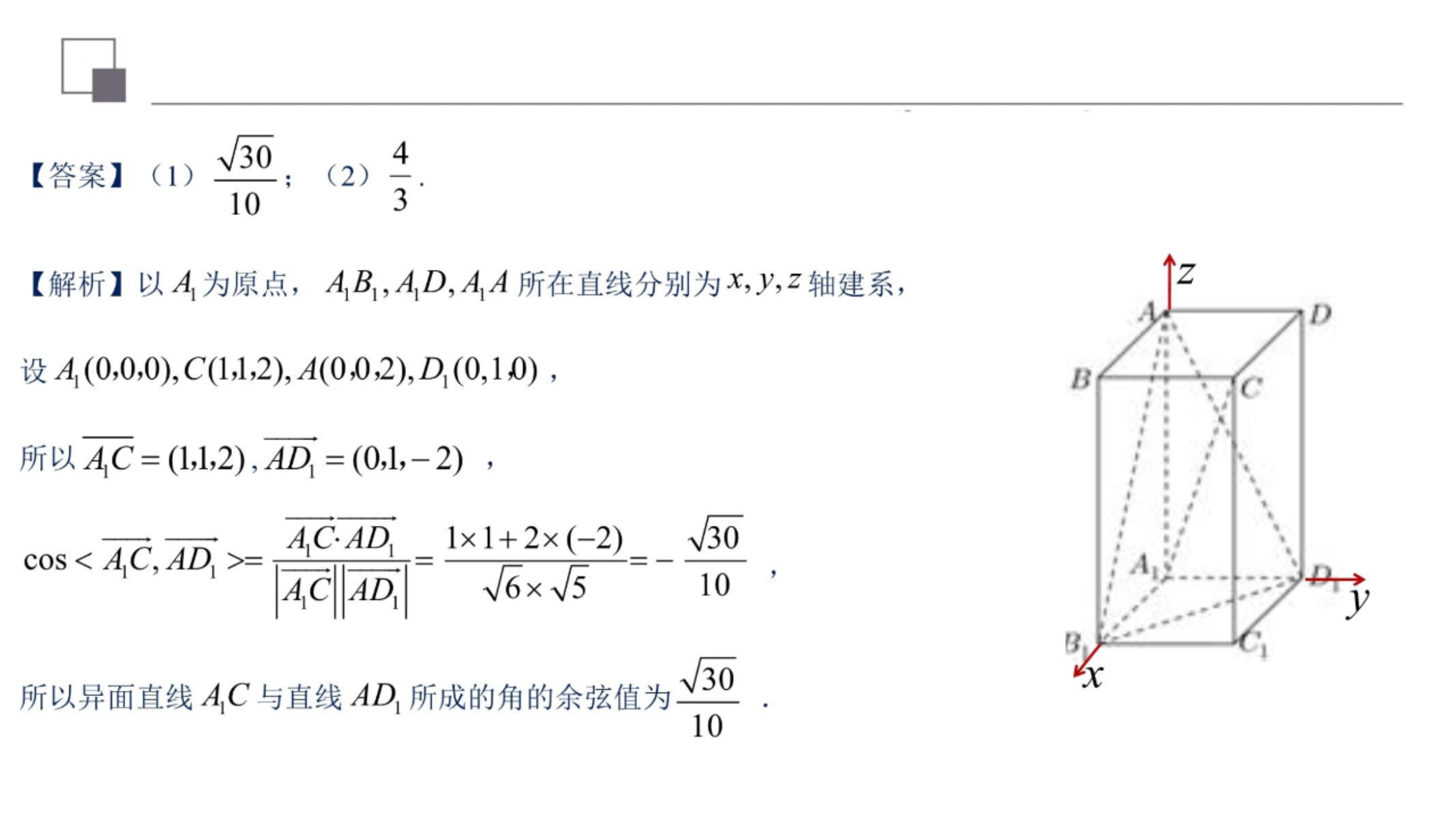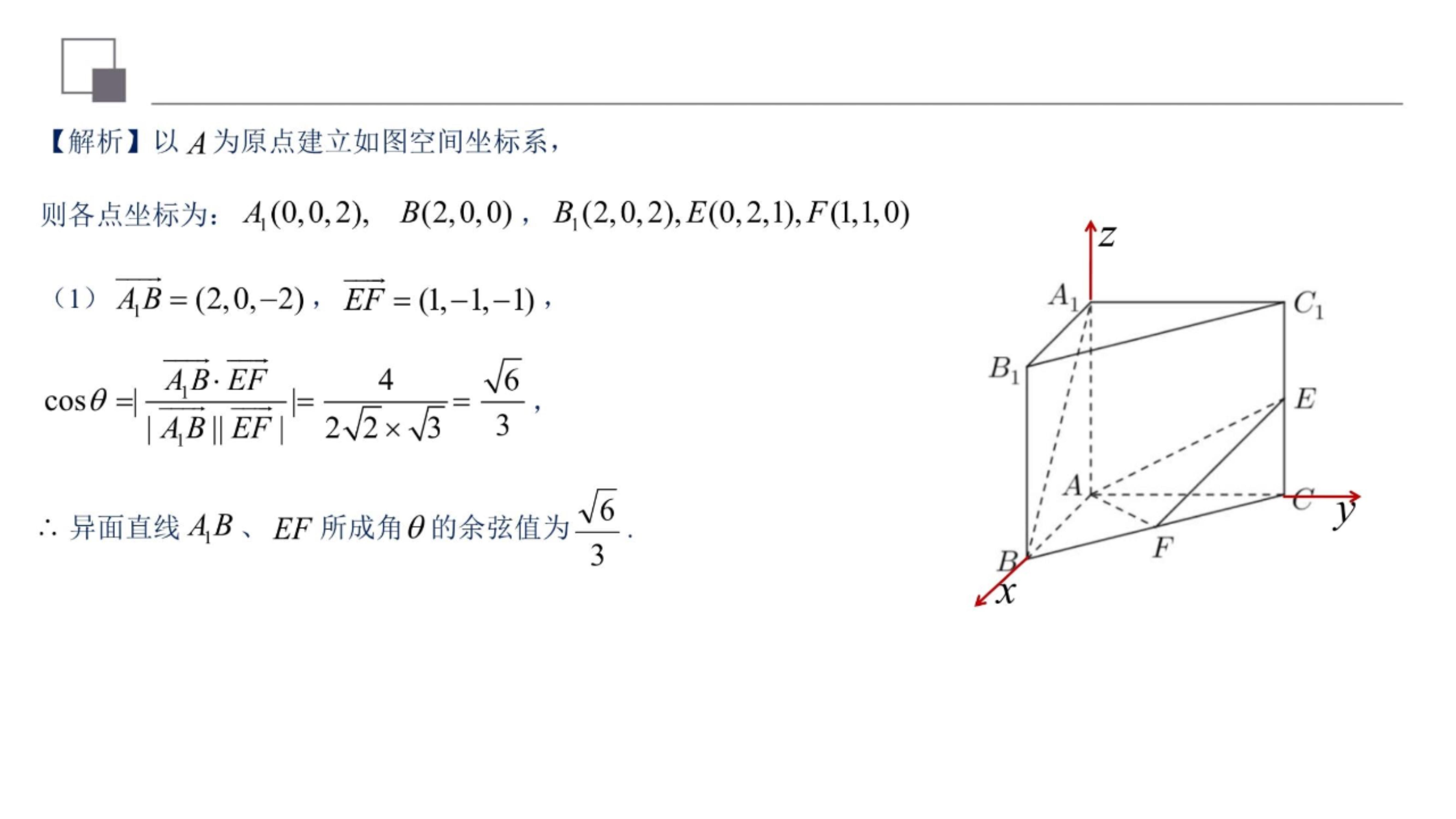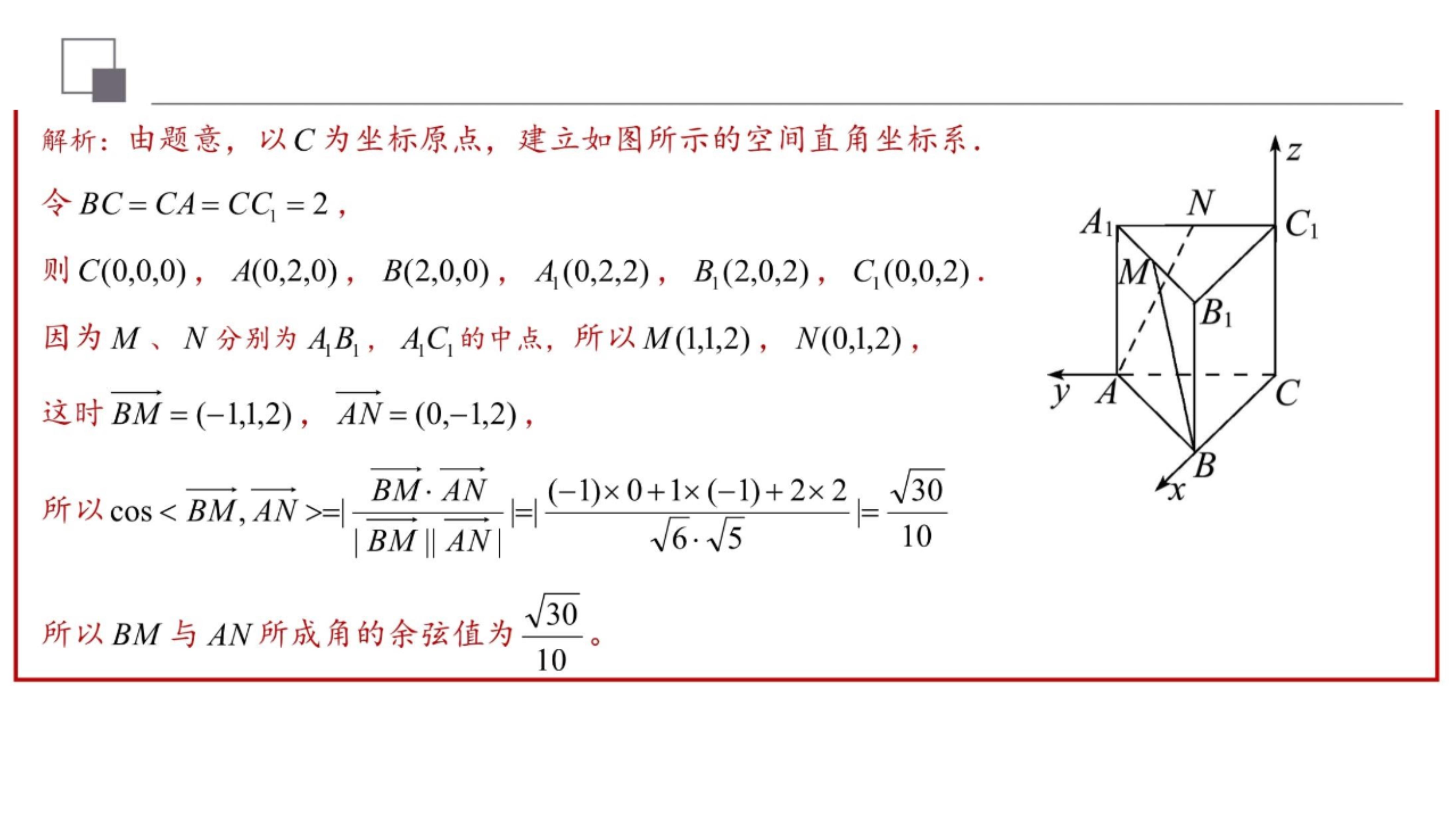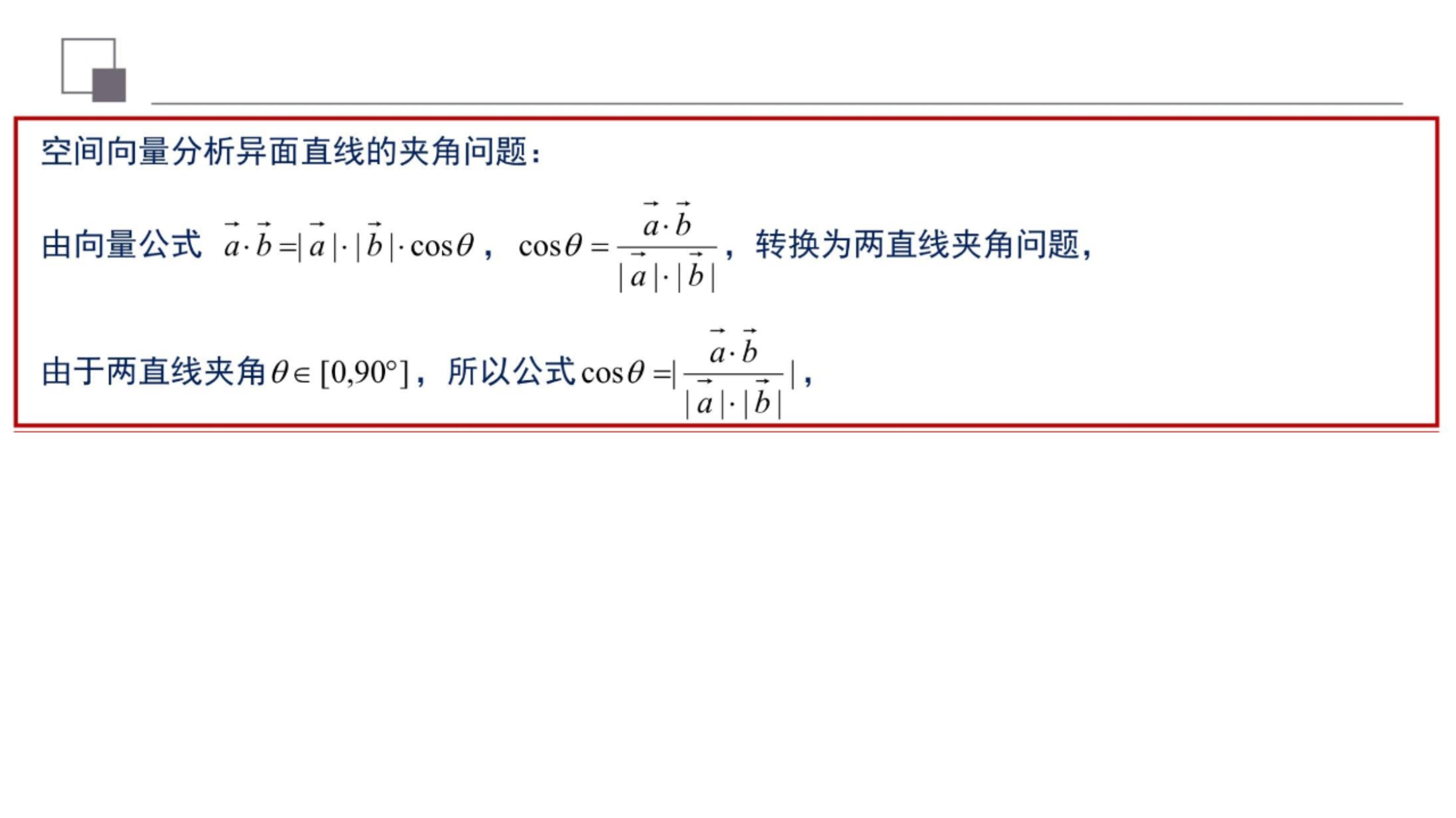 向量几何法:选取空间坐标原点,建立空间坐标系并将两条直线上任意两点的坐标读出,并计算出两直线的向量,并运用向量的运算法则(例如分配律、共线向量)来求出cosθ。