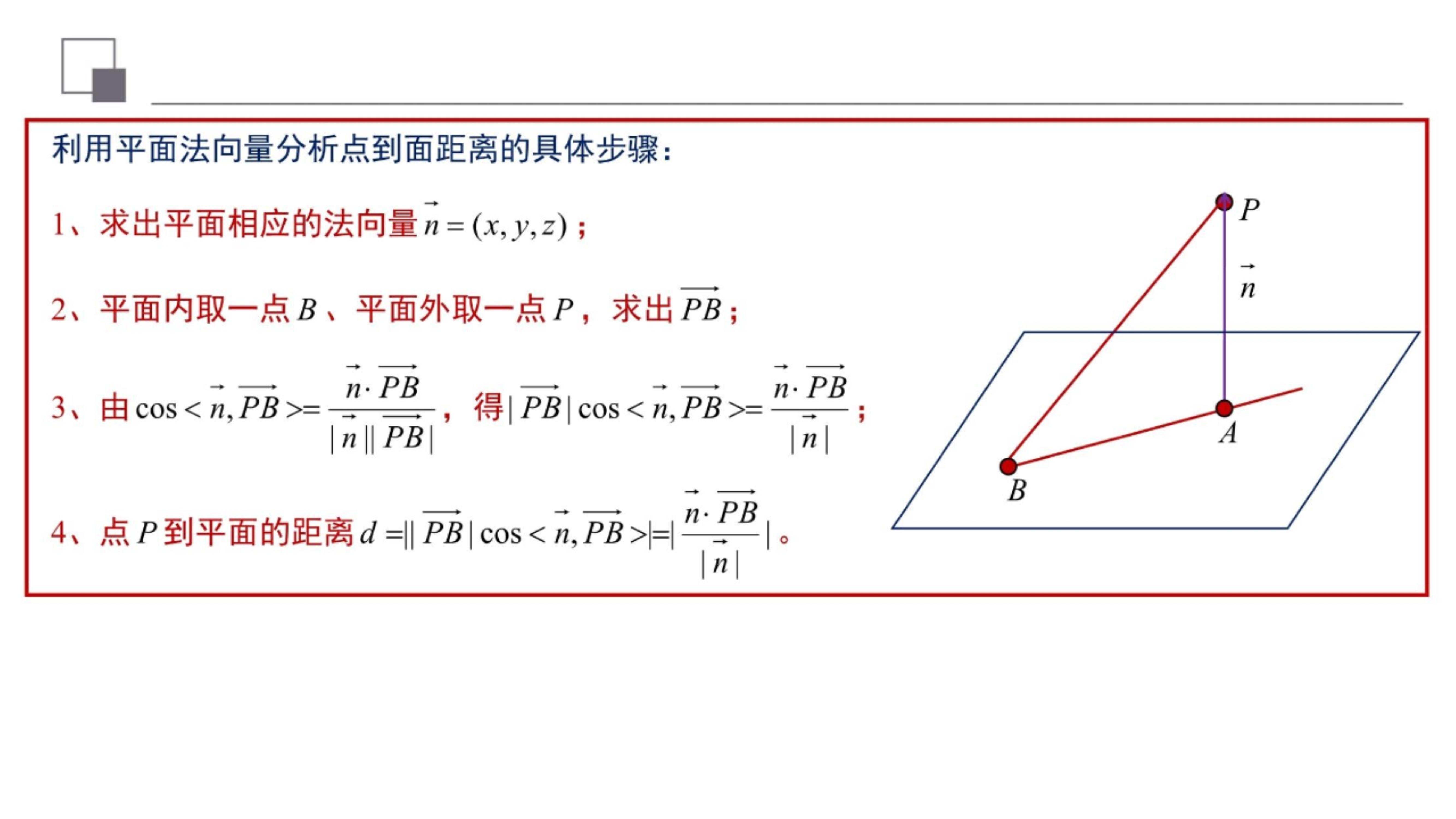 4、学会利用空间向量公式转换为点到面距离的分析过程。