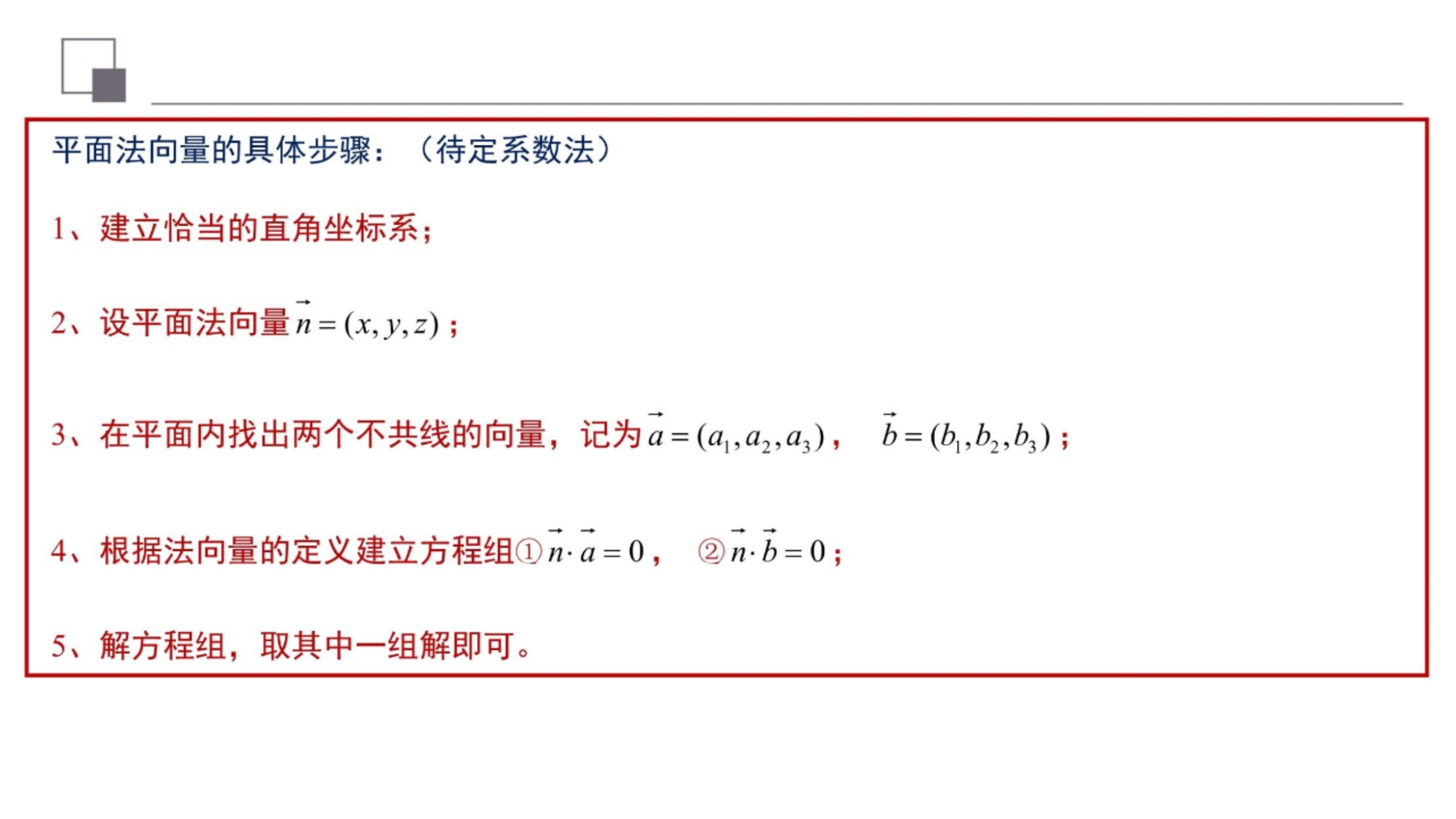 4、根据法向量的定义建立方程组①n·a=0 ②n·b=0