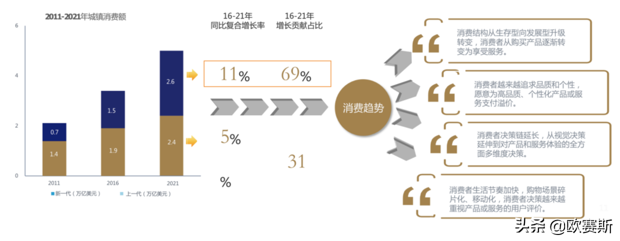 据BCG预计,在2016-2021年间,新一代消费力的同比复合增长率 为11%,是上一代的2倍多。同期新一代消费的增长贡献占比达到69%,上一代贡献占比仅为31%。