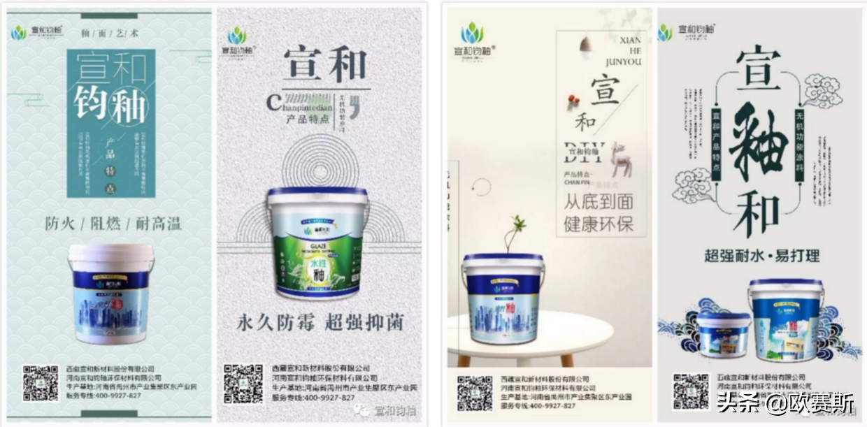 主售是无机干粉系列和水性釉系列产品,宣传卖点主要是防火、防霉、防阻燃、超强耐水等等一些核心概念,这也是无机涂料品类里一些通用的卖点。