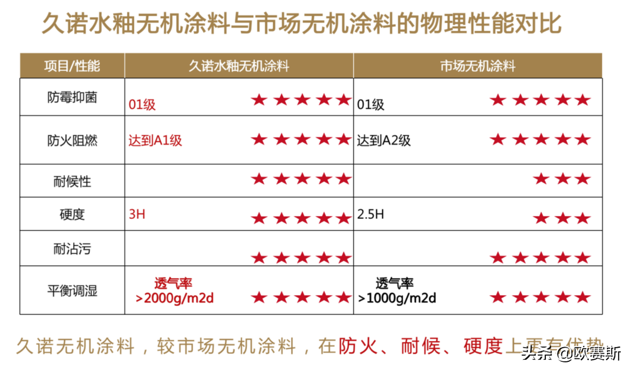 从底到面\安全环保、超强耐水\易打理、耐火\阻燃\高温、超强防霉抑菌、平衡调湿、抗沾污力强、易施工\缩短工期、超强寿命\与墙同寿。所以说无机涂料有着无可比拟的优势,