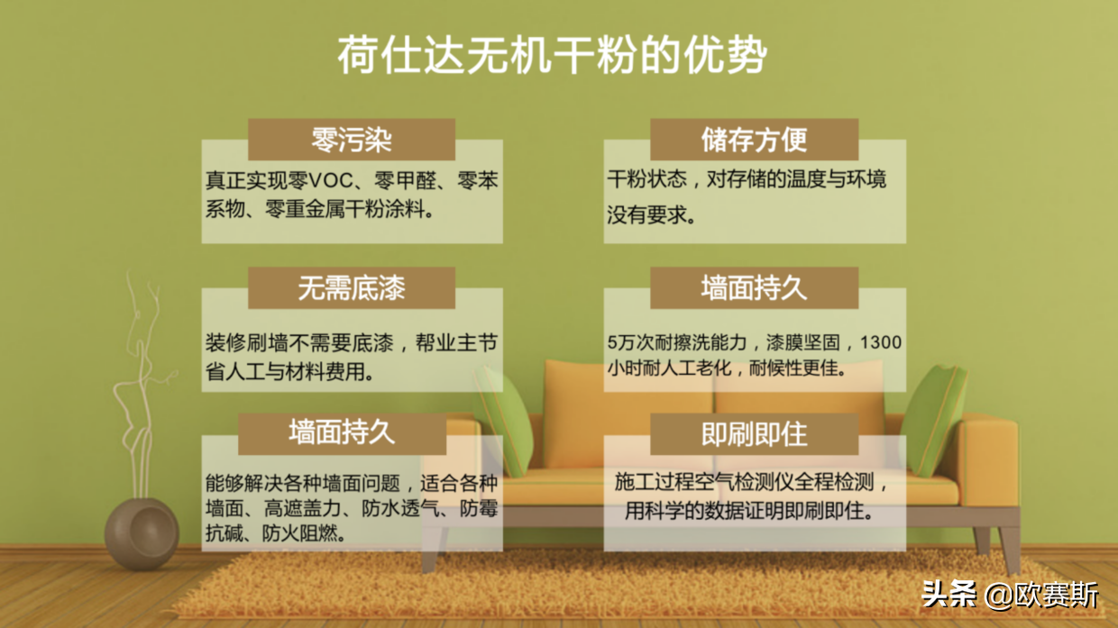 主打零污染、储存方便、无需底漆、墙面持久、墙面持久、即刷即住。