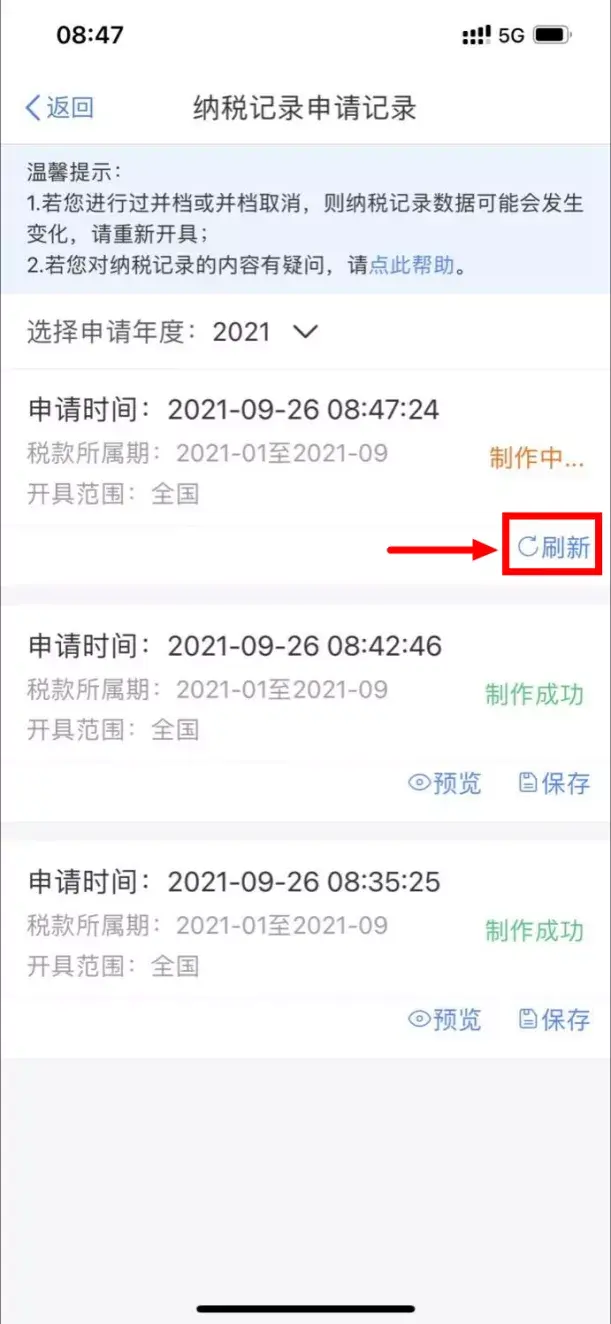 4.进入后界面图片如下,申请记录列表页面可查询出所有渠道开具的纳税记录,点击刷新按钮后会显示制作成功。