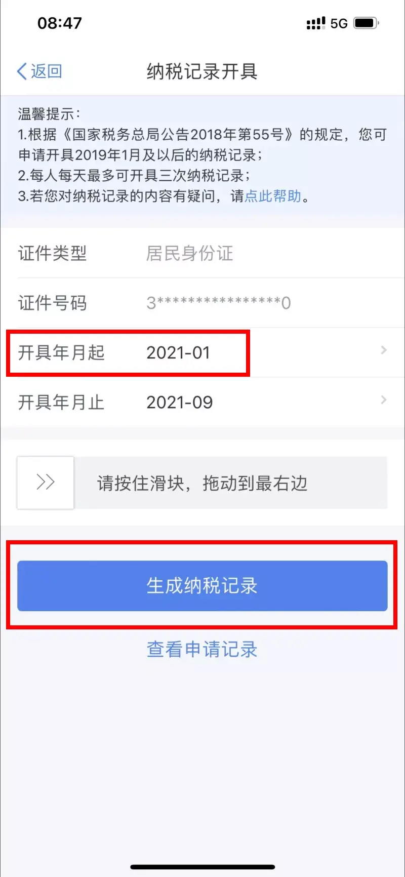 3.选择开具年月起止,拖动滑块,点击【生成纳税记录】
