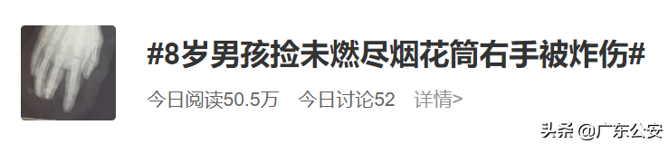 每逢佳节,市民群众都会燃放烟花爆竹增添节日气氛。但近年来,因违规燃放烟花爆竹所引发的安全事故屡屡发生。近日,广西河池一名8岁男孩捡未燃尽的烟花筒玩耍,右手被炸得血肉模糊,骨头外露。事件经网络报道后,引发广泛关注。