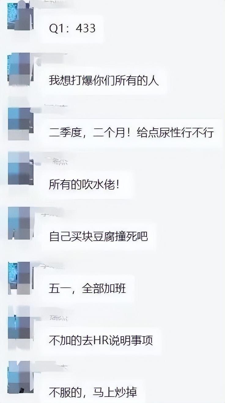 李瑞杰在公司群中言辞激烈,公然宣称“没有加班费,不服的,马上炒掉。”甚至出现“我想打爆你们所有人”“自己买块豆腐撞死吧”等极具情绪性的发泄言辞。