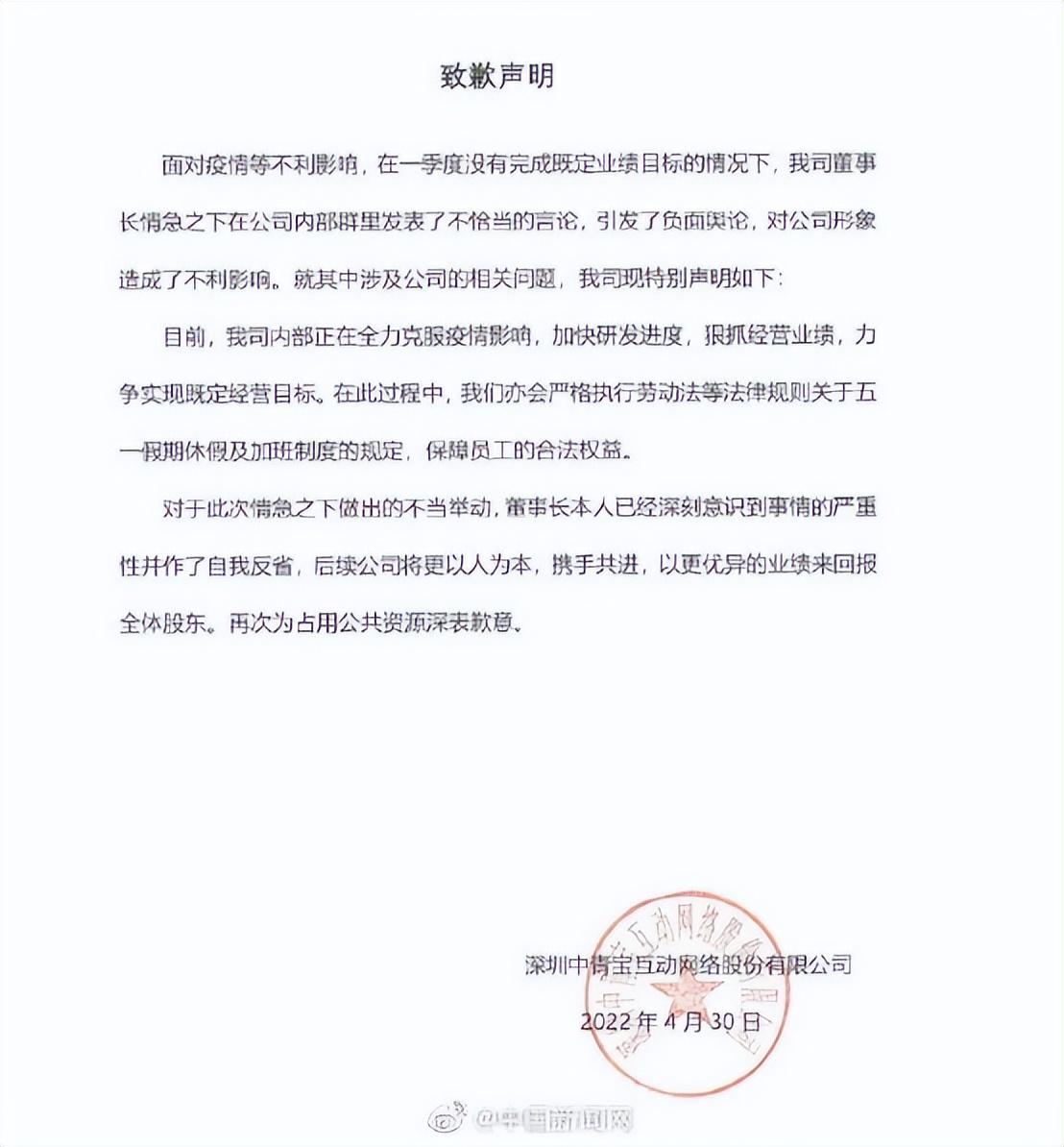 被公众广泛关注后,中青宝于5月1日发布致歉声明称,面对疫情等不利影响,在一季度没有完成既定业绩目标的情况下,公司董事长情急之下在公司内部群里发表了不恰当的言论。并称董事长本人已经深刻意识到事情的严重性并作了自我反省。