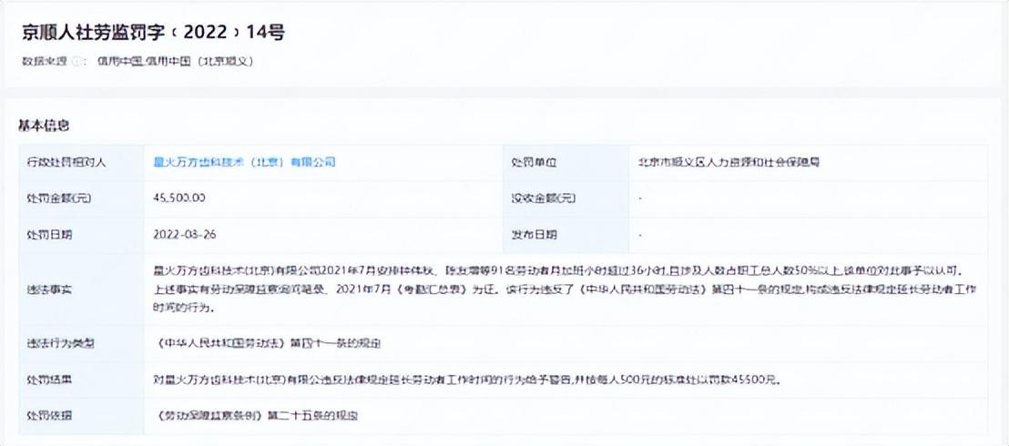 处罚事由显示,星火万方齿科技术(北京)有限公司(以下简称“星火齿科公司”)2021年7月安排91名劳动者月加班小时超过36小时,且涉及人数占职工总人数50%以上。该行为违反了《中华人民共和国劳动法》第四十一条的规定,构成违反法律规定延长劳动者工作时间的行为。