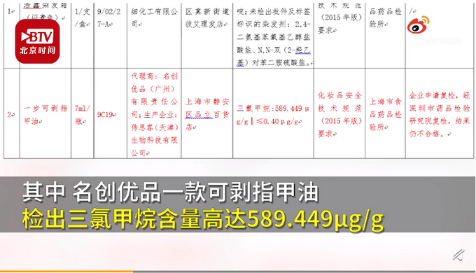 作为国内10元店里的头牌,名创优品商品出现问题的情况很多次了。这不在这个月的23日,上海药监局检测的名创优品代理销售的一款指甲油,其三氯甲烷的含量高达589.449μg/g,比《化妆品安全技术规范》(2015年版)中规定的检测限值超标1400多倍。