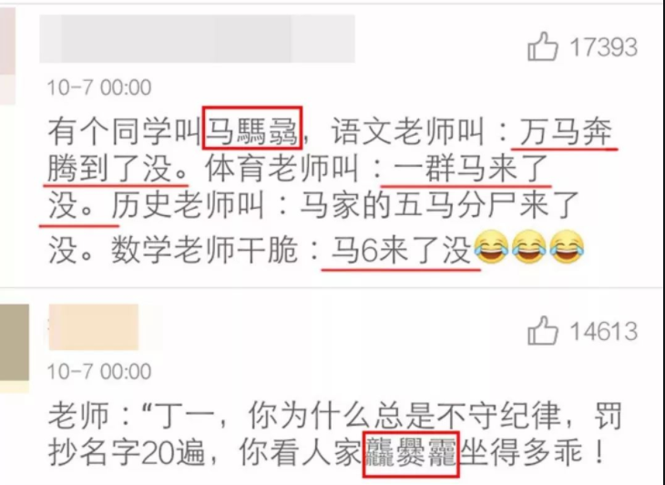 还有很多学生党表示,这下好了,老师唯独能记住你的名字,以后想逃课是不可能了,不仅如此,还会成为老师的重点关注对象,一不留神就会被老师盯上,不得不说,家长给取名还真是前卫,还有一个网友表示,有个朋友叫“灿灿”,在登记名字的时候,因为口音的问题,登记成了“串串”。