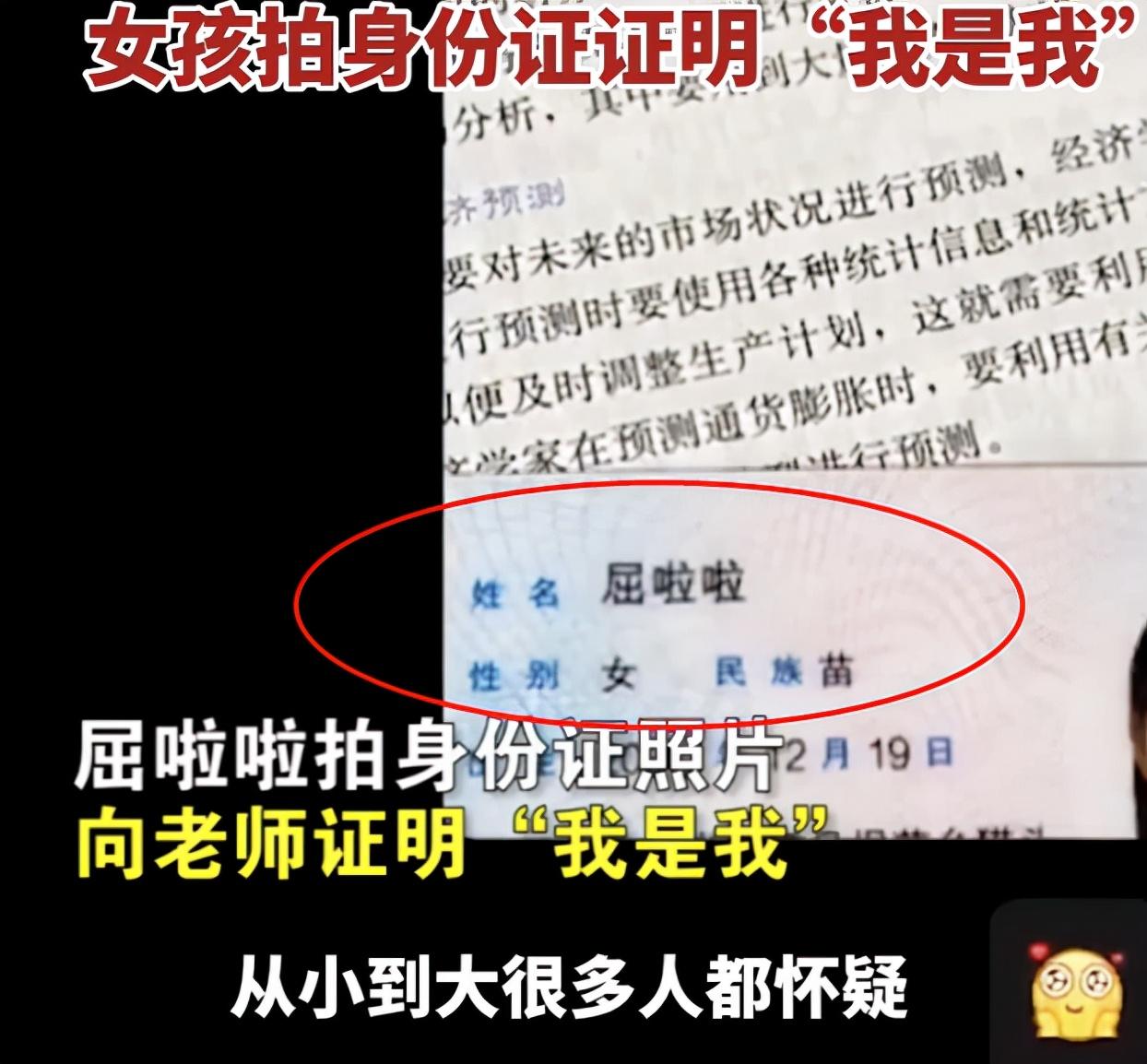 这名同学也很委屈,自己的名字明明是真名,但是老师偏偏不信,觉得这是网名,自己取的代号,逼得女生只能亮出身份证,证明“我是我”,老师也是看见身份证信息之后,才相信,要不然谁信家长能给学生取名叫“屈啦啦”呢?名字挺可爱,就是有点草率了。