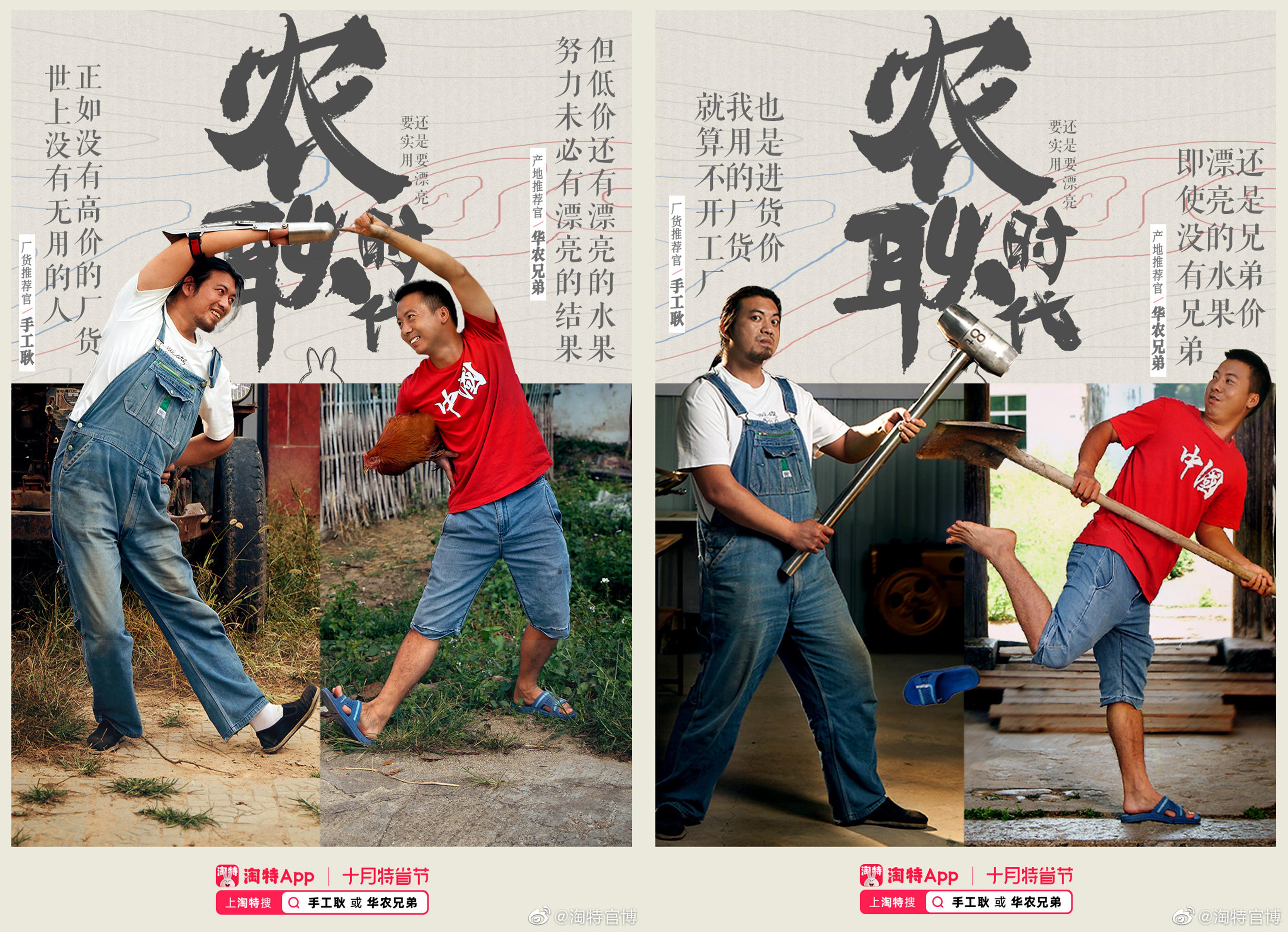 为宣传「十月特省节」,淘特邀请华农兄弟和手工耿,组建「农耿时代」cp。宣传片中,二人耿直地告诉大家:实用厂货、漂亮水果,上淘特买准没错。此外,淘特还邀请大家搜索手工耿和华农兄弟,抽免单红包。淘宝特价版改名为淘特、开启平台升级后,告诉消费者淘特平台「不止低价」,更有特便宜、特简单、特地道、特放心的服务。