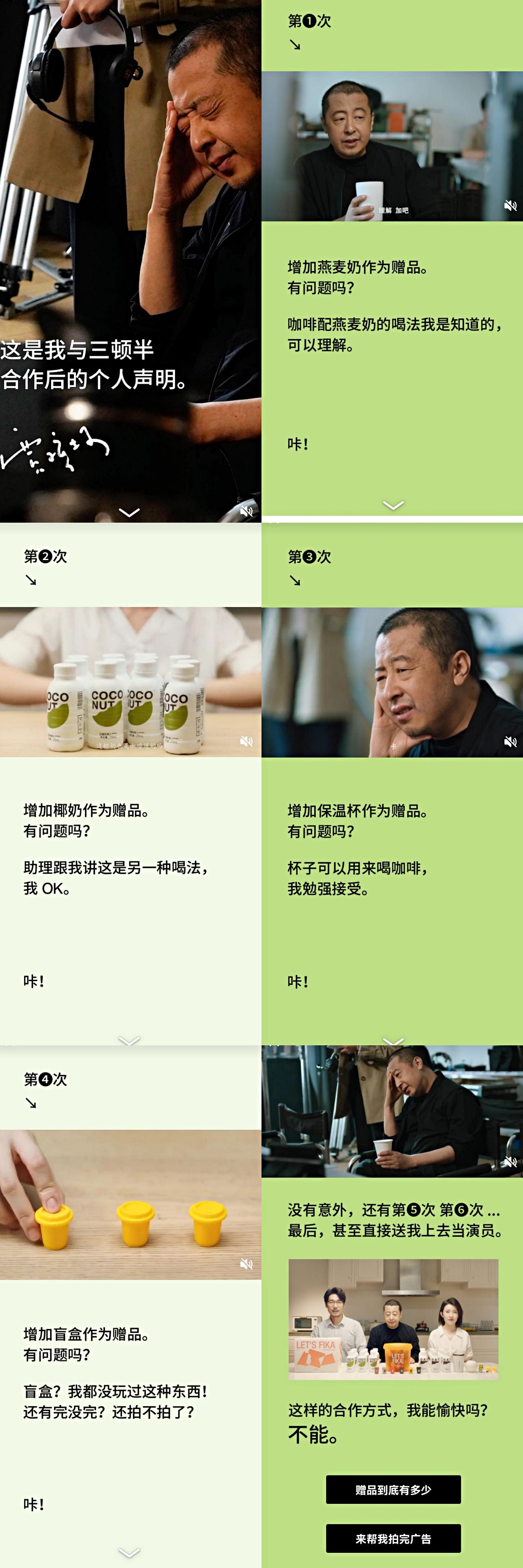 近日,三顿半与导演贾樟柯打造反转戏码:「贾樟柯的个人声明」H5 广告。首页是贾樟柯的痛苦表情和「这是我与三顿半合作后的个人声明」字幕,后面则是贾樟柯关于与三顿半「不愉快」合作的吐槽。贾樟柯指出,在三顿半福利版超级咖啡桶广告拍摄时,品牌方三顿半不断提出新需求,使拍摄难度逐次增加。三顿半这次 campaign,通过贾樟柯「个人声明」的方式制造悬念,在「吐槽」中变相呈现产品卖点,吸引受众关注,最后放出产品链接和广告片,使产品卖点一步步深入消费者内心。