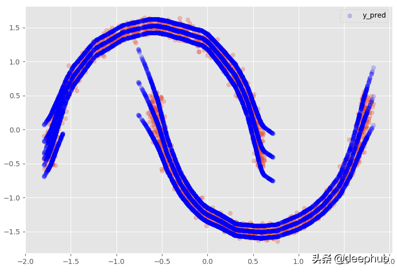 EPOCHS = 10000 BATCH_SIZE=len(X_train) model = MDN(n_mixtures = -1, #-1 dist = 'laplace', input_neurons = 1000, #1000 hidden_neurons = [], #25 gmm_boost = False, optimizer = 'adam', learning_rate = 0.0001, #0.00001 early_stopping = 200, tf_mixture_family = True, input_activation = 'relu', hidden_activation = 'leaky_relu') model.fit(X_train, y_train, epochs = EPOCHS, batch_size = BATCH_SIZE)训练完成后使用“最佳混合概率(Pi 参数)策略”预测测试数据集并绘制结果(y_pred vs y_test):