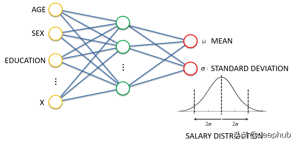 密度网络也是神经网络,其目标不是简单地学习输出单个连续值,而是学习在给定一些输入特征的情况下输出分布参数(此处为均值和标准差)。 在上面的例子中,给定年龄、性别、教育程度等特征,神经网络学习预测期望工资分布的均值和标准差。预测分布比预测单个值具有很多的优势,例如能够给出预测的不确定性边界。 这是解决回归问题的“贝叶斯”方法。下面是预测每个预期连续值的分布的一个很好的例子: