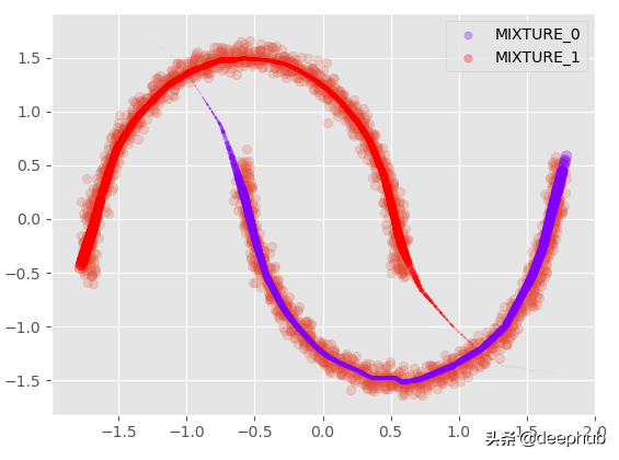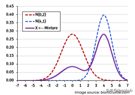 混合密度网络使用这样的假设,即任何像这种双峰分布的一般分布都可以分解为正态分布的混合(该混合也可以与其他类型的分布一起定制 例如拉普拉斯):