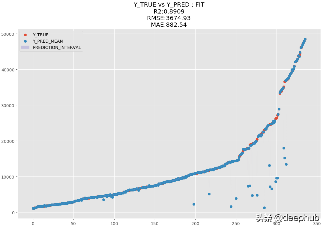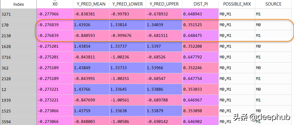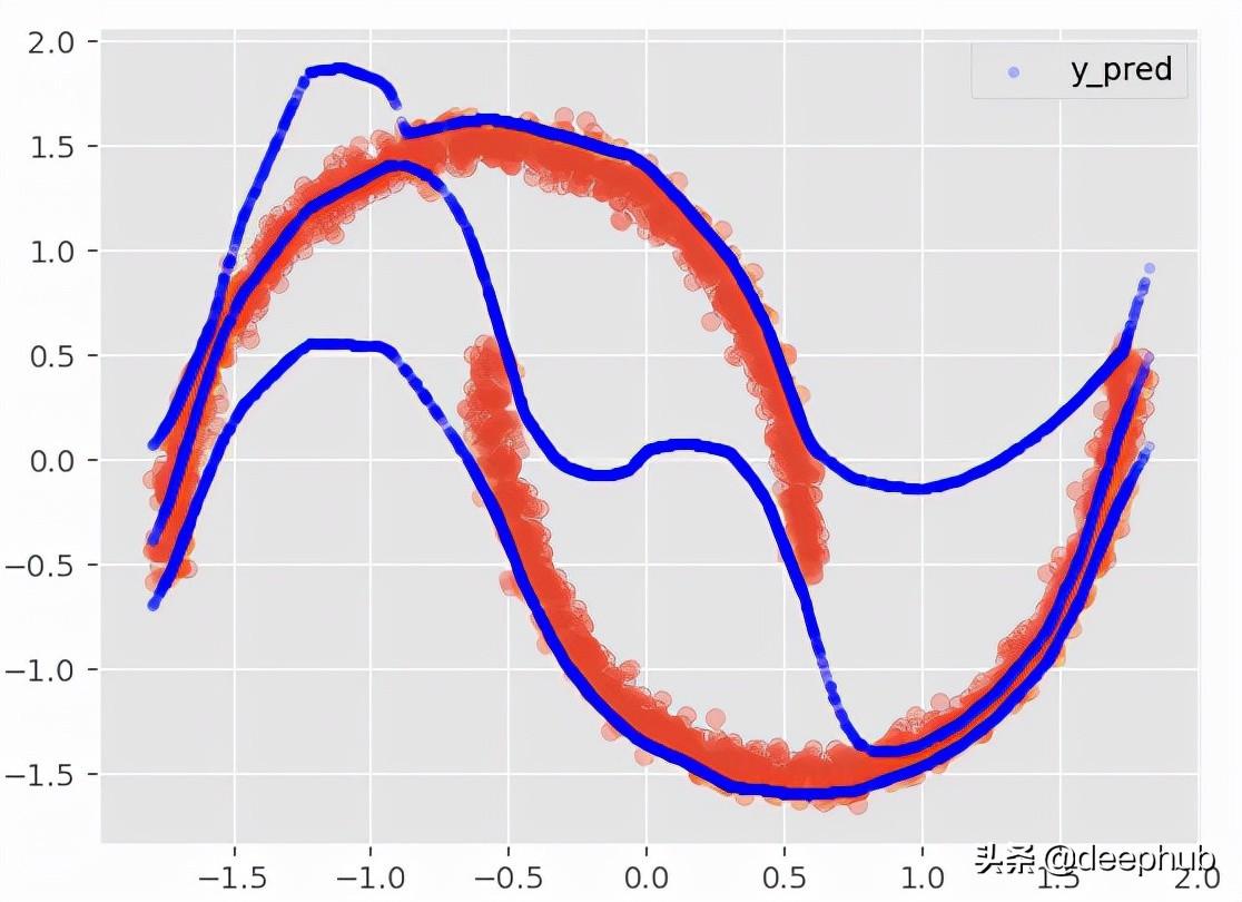 y_pred_dist = model.predict_dist(X_test, q = 0.95, y_scaler = y_scaler) y_pred_dist· 与线性或非线性经典 ML 模型相比,MDN 在单变量回归数据集中表现出色,其中两个簇相互重叠,并且 X 可能有多个 Y 输出。
