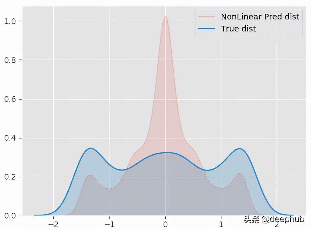 model = KernelRidge(kernel = 'rbf') model.fit(X, y) y_pred = model.predict(X) plt.scatter(X, y, alpha = 0.3) plt.scatter(X,y_pred) plt.title('Non Linear Regression')sns.kdeplot(y_pred.ravel(), shade=True, alpha = 0.15, label = 'NonLinear Pred dist') sns.kdeplot(y.ravel(), shade=True, label = 'True dist')虽然结果也不尽如人意,但是比上面的线性回归要好很多了。