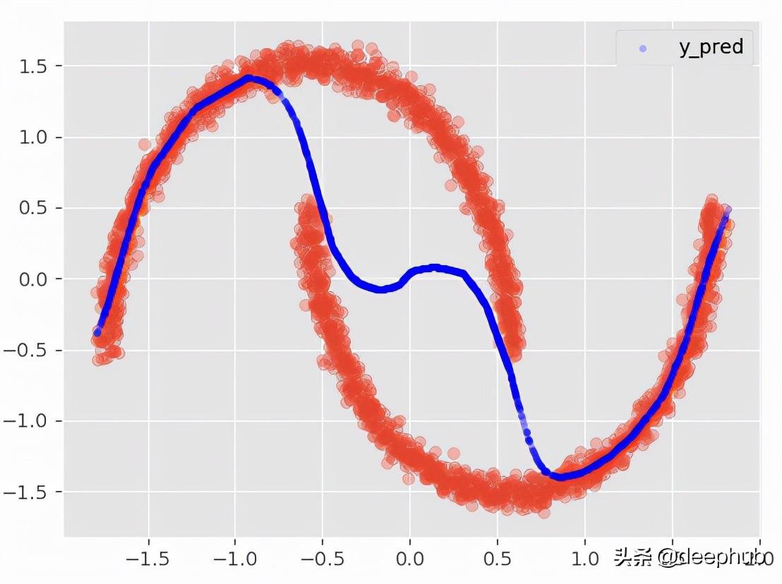 两个模型都没有成功的主要原因是:对于同一个 X 值存在多个不同的 y 值……更具体地说,对于同一个 X 似乎存在不止一个可能的 y 分布。 回归模型只是试图找到最小化误差的最优函数,并没有考虑到密度的混合,所以 中间的那些X没有唯一的Y解,它们有两种可能的解,所以导致了以上的问题。