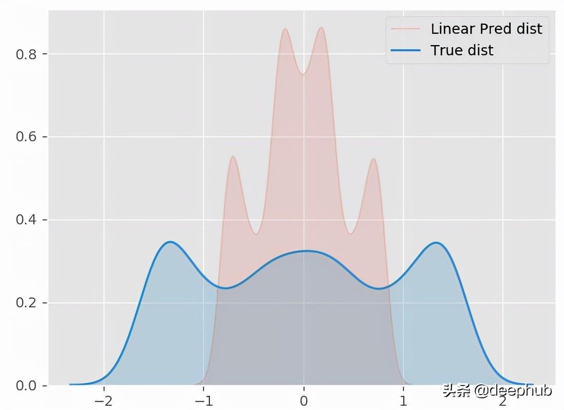 model = LinearRegression() model.fit(X.reshape(-1,1), y.reshape(-1,1)) y_pred = model.predict(X.reshape(-1,1)) plt.scatter(X, y, alpha = 0.3) plt.scatter(X,y_pred) plt.title('Linear Regression')sns.kdeplot(y_pred.ravel(), shade=True, alpha = 0.15, label = 'Linear Pred dist') sns.kdeplot(y.ravel(), shade=True, label = 'True dist')效果必须不好!现在让尝试一个非线性模型(径向基函数核岭回归):