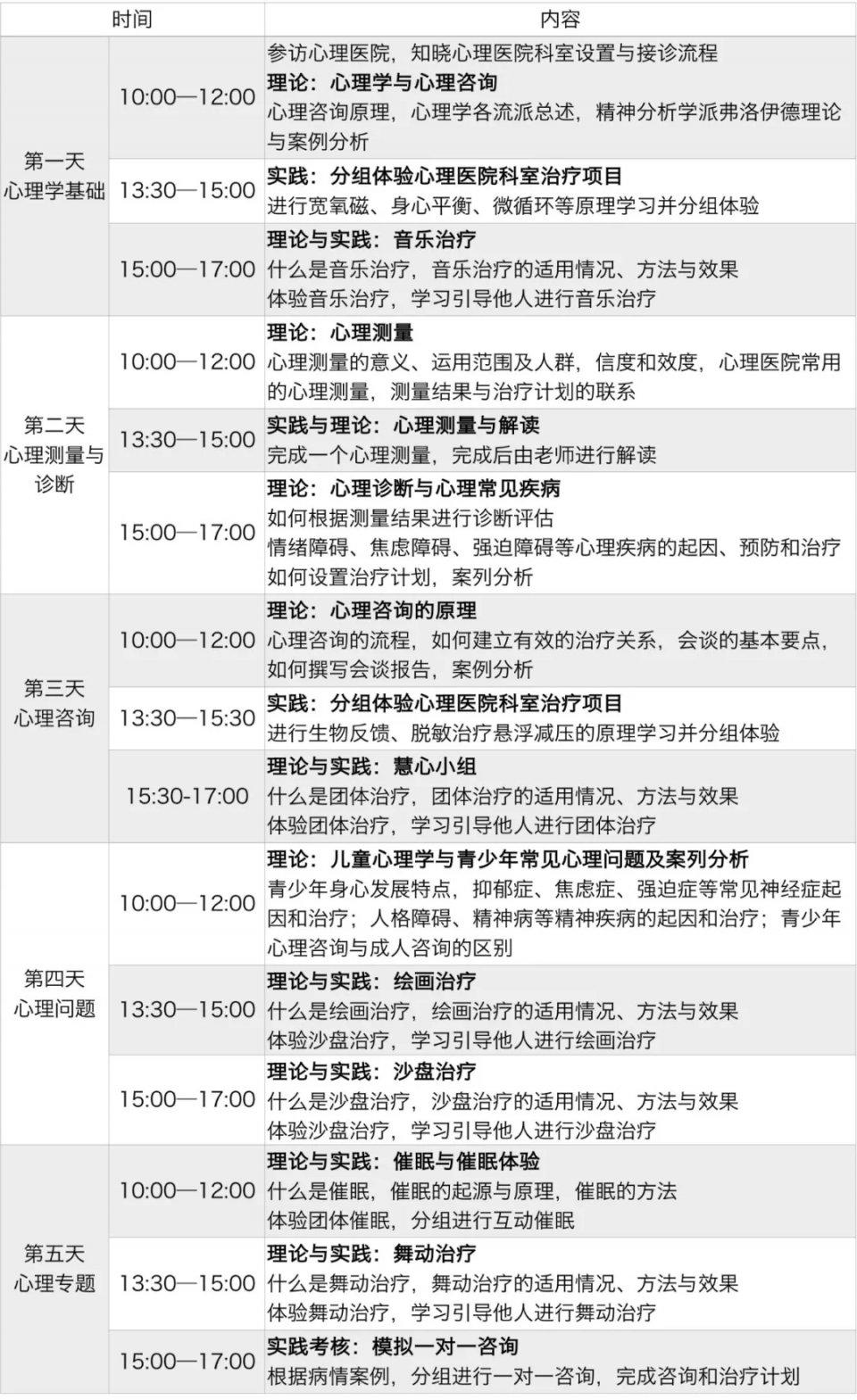 • 学习心理学和心理咨询基础,掌握心理学不同分支学派的基础知识内容,儿童心理学和青少年常见心理问题、催眠基础知识与体验