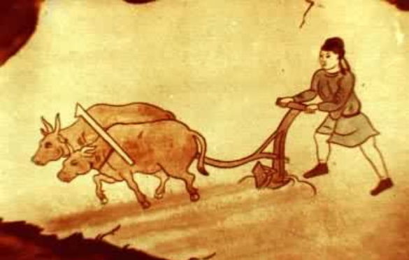 再次,农业技术转型,谁抓住了机遇就能后来居上战国后期,中国缓慢进入铁器时代,在耕种技术上也因此迎来了变革:牛耕技术。以前耕地主要靠人力,这种方法费力不讨好,效果极差;后来人们发明了铁犁,用牛拉着它耕作,既省力效果又好,称为牛耕。
