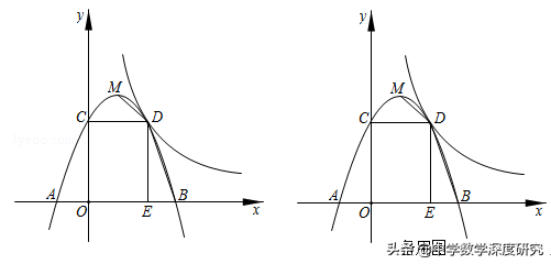 例1(2019•烟台中考题)如图,顶点为M的抛物线y=ax2+bx+3与x轴交于A(﹣1,0),B两点,与y轴交于点C,过点C作CD⊥y轴交抛物线于另一点D,作DE⊥x轴,垂足为点E,双曲线y=6/x(x>0)经过点D,连接MD,BD.