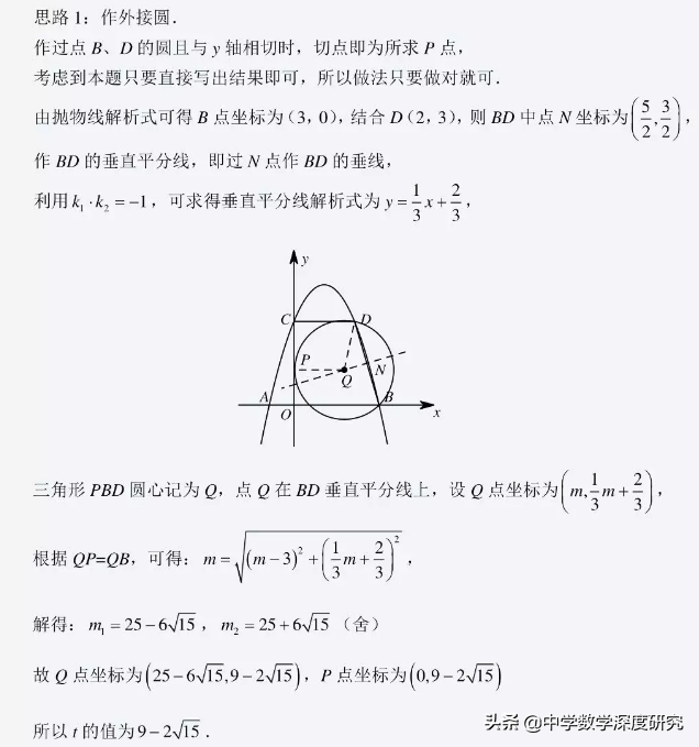 作△PBD的外接圆N,当⊙N与y轴相切时此时圆心N到BD的距离最小,圆心角∠DNB最大,则,∠BPD的度数最大;
