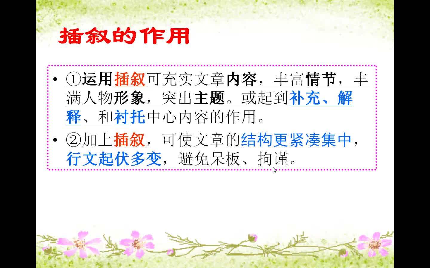 是指在叙述的过程中,由于某种需要,中断了原来的叙述而插进另一段叙述。这段插入的叙述结束后,仍回到原来的事件上去,继续原来事件的叙述。插叙是对文章内容的必要补充。