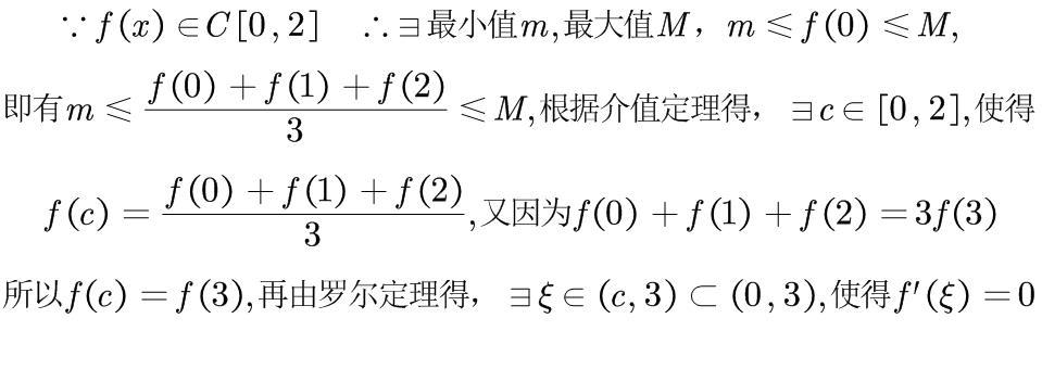 这里的已知条件f(0)+f(1)+f(2)=3f(3)可以用介值定理得出一个有用的条件,有此条件刚好满足罗尔定理所需条件,则原结论可证: