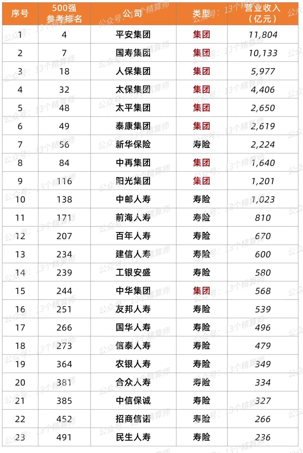 “13精”统计了2021年各家保险公司年报的营收情况,参考中国500强榜单进行了排名~