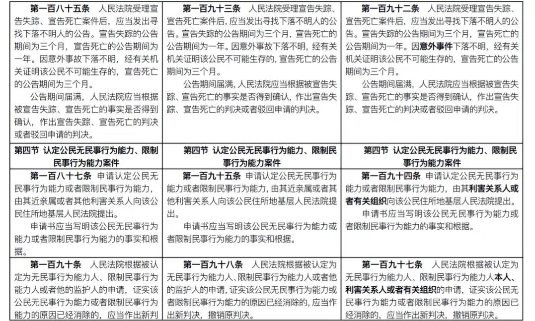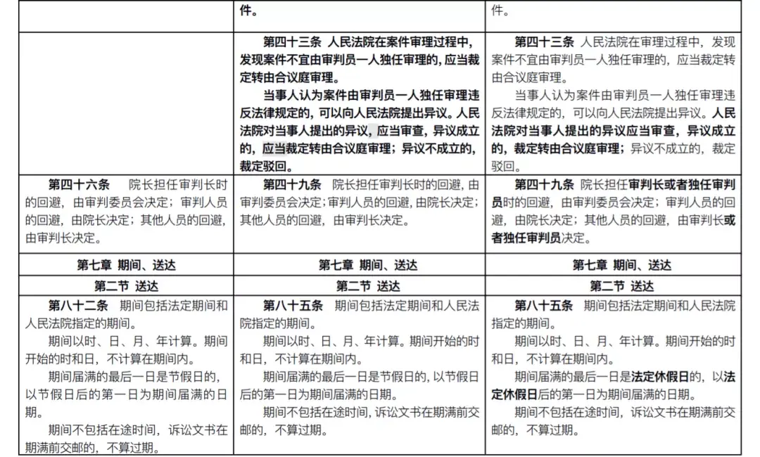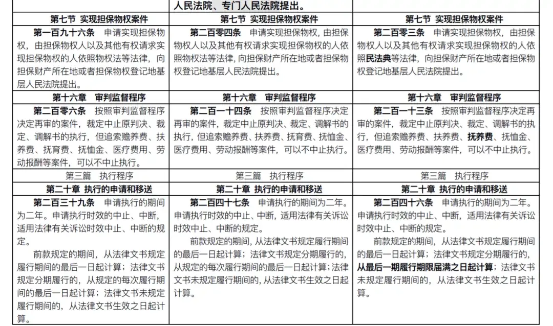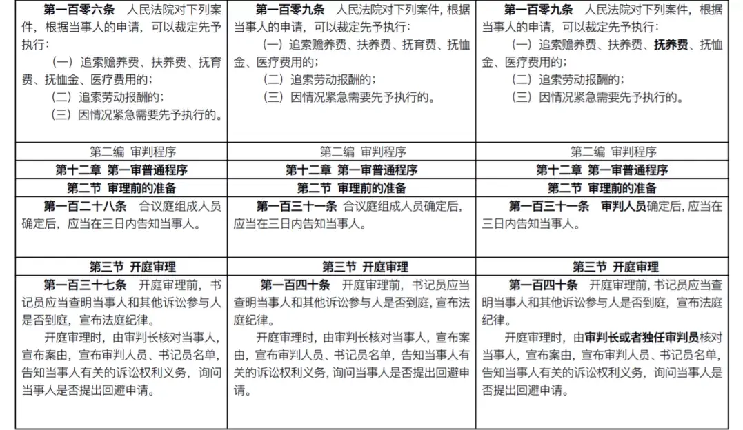 十六、将第十三条中的“诚实信用”修改为“诚信”;将第四十六条、第一百三十七条、第一百四十一条中的“审判长”修改为“审判长或者独任审判员”;将第八十二条中的“节假日”修改为“法定休假日”;将第一百零六条、第一百五十一条、第二百零六条、第二百五十七条中的“抚育费”修改为“抚养费”;将第一百二十八条中的“合议庭组成人员”修改为“审判人员”;将第一百四十九条中的“由本院院长批准”修改为“经本院院长批准”;将第一百八十四条、第一百八十五条中的“意外事故”修改为“意外事件”;将第一百八十七条中的“其近亲属或者其他利害关系人”修改为“利害关系人或者有关组织”;将第一百九十条中的“或者他的监护人”修改为“本人、利害关系人或者有关组织”;将第一百九十三条中的“民法通则”修改为“民法典”;将第一百九十六条中的“物权法”修改为“民法典”;将第二百三十九条中的“从规定的每次履行期间的最后一日起计算”修改为“从最后一期履行期限届满之日起计算”。