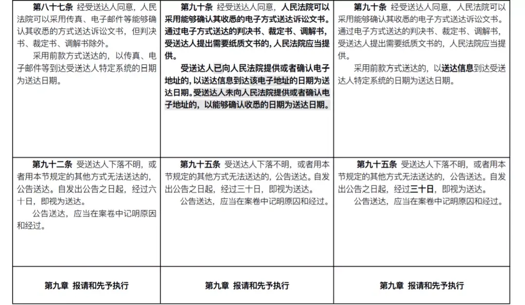 六、将第八十七条改为第九十条,修改为:“经受送达人同意,人民法院可以采用能够确认其收悉的电子方式送达诉讼文书。通过电子方式送达的判决书、裁定书、调解书,受送达人提出需要纸质文书的,人民法院应当提供。