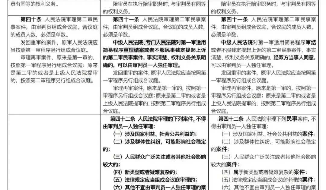 三、将第四十条改为第四十一条,增加一款,作为第二款:“中级人民法院对第一审适用简易程序审结或者不服裁定提起上诉的第二审民事案件,事实清楚、权利义务关系明确的,经双方当事人同意,可以由审判员一人独任审理。”