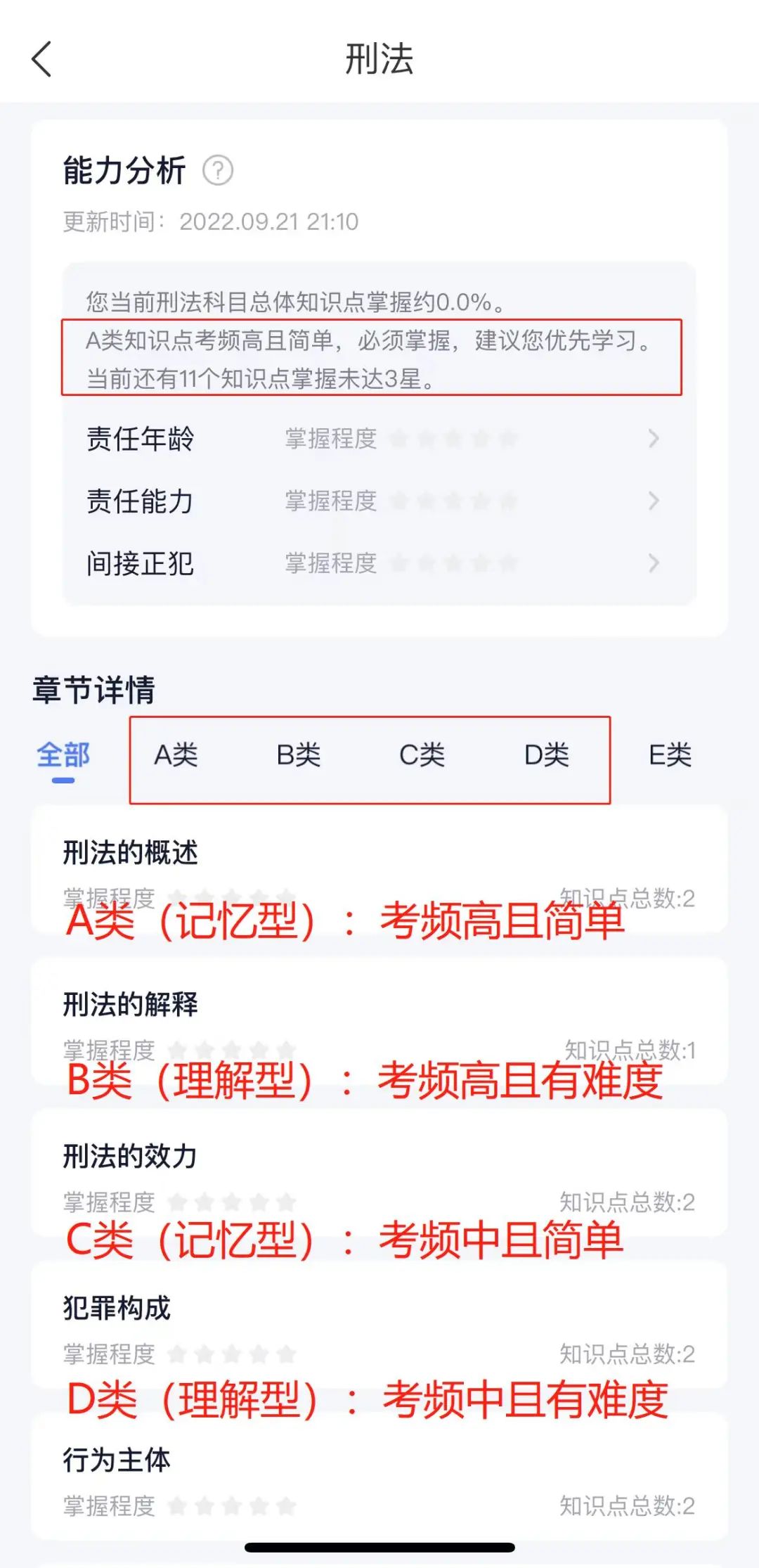 在觉晓法考APP中的知识图谱界面,我们已经统计了各知识点的考频和难度,里面就有ABCDE知识点的分类。ABC就是每年常考、必考点,你可以去看这些,里面还附有样板题,你可以通过样板题看看自己掌握如何。