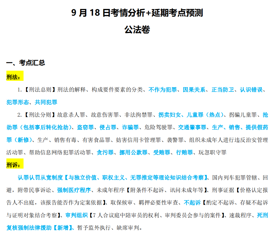 2、新增、修改必考。如今年大纲修改的,刑诉的死刑复核法律援助意见,商经的信托,行政修改的行政赔偿,民诉修改的调解那块,基本每个科目修改和变化的都考虑到了!