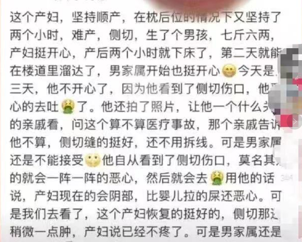 而且还拍了照片给亲戚,问这算不算医疗事故,亲戚告诉他这侧切缝合得很好,不用拆线!