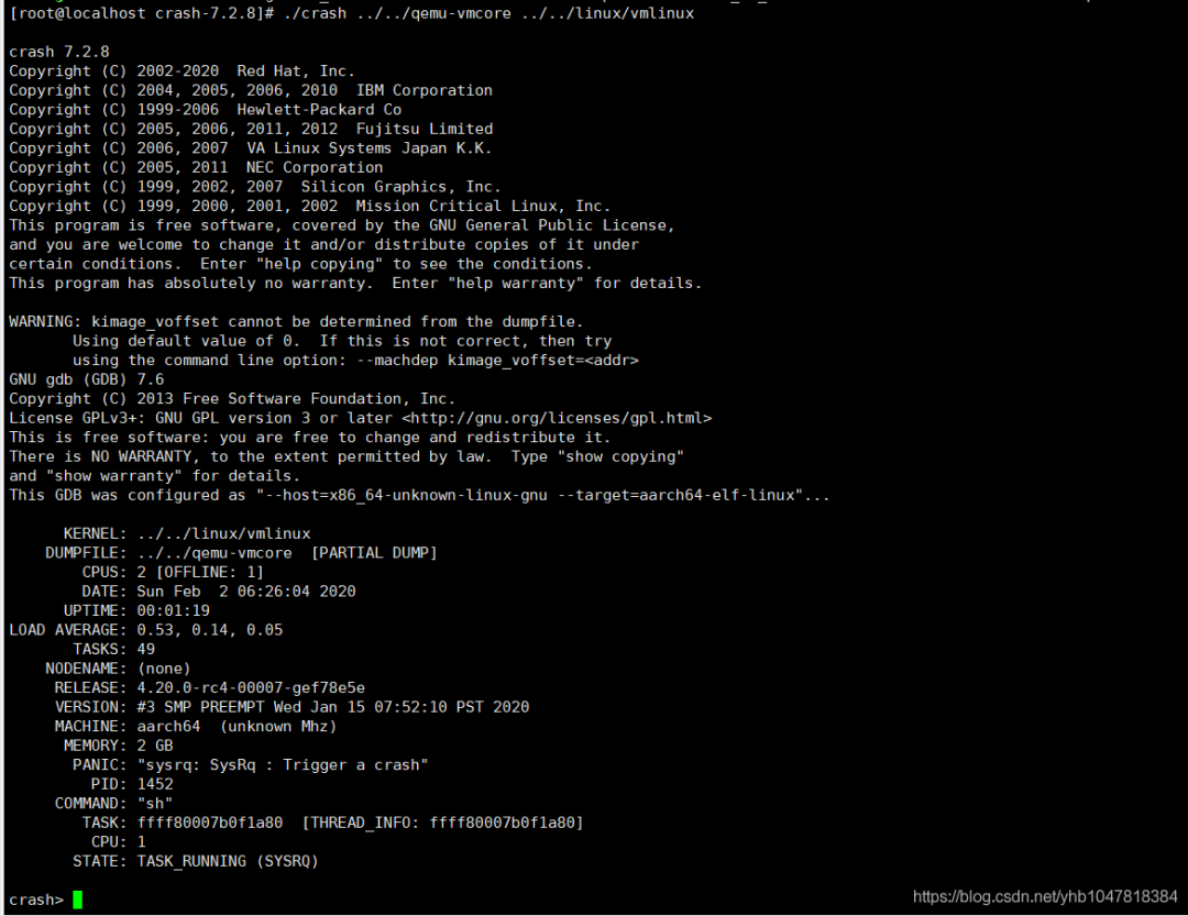 crash的版本要和内核的版本保持一致, 比如上面成功dump了qemu arm64的coredump文件,就需要配套的arm64的crash工具进行分析,否则会报兼容性错误。