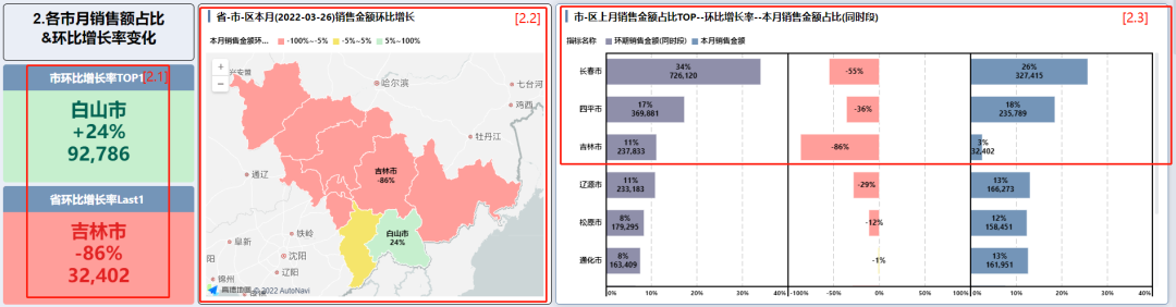 注意:这里本月对比的环期是上月同时段(2.01~2.26)的销售额,而不是上月的全月,天数不同对比意义并不大。这也是整份报表从头贯彻到尾的,这样能保证整份报表在当月的任何时候来看都有意义,而不是每月结束看一次总结“月度报告”,体现[可视化]的[实时性]。